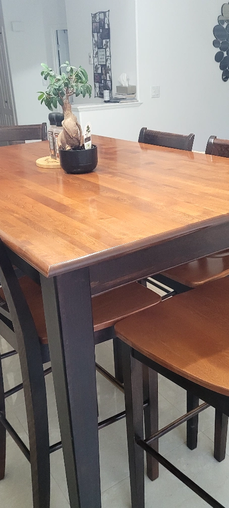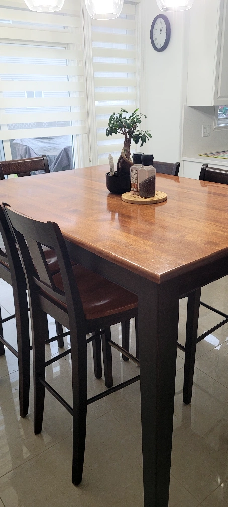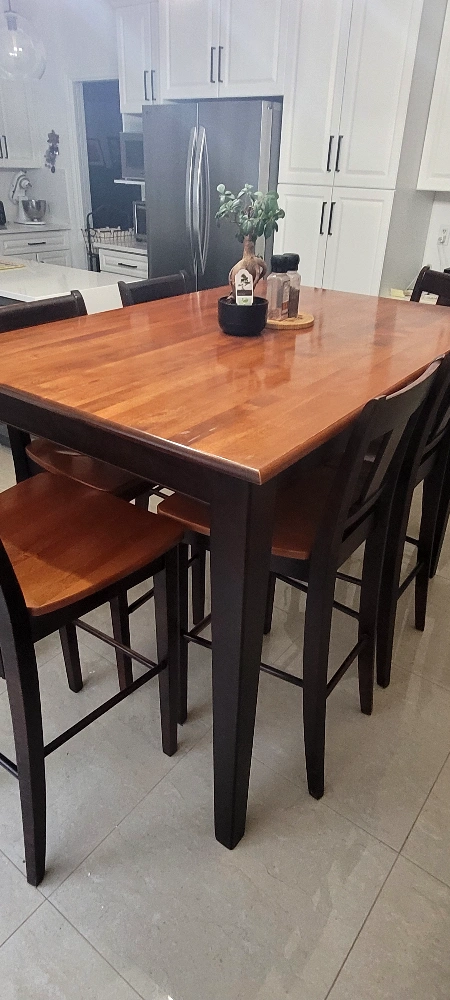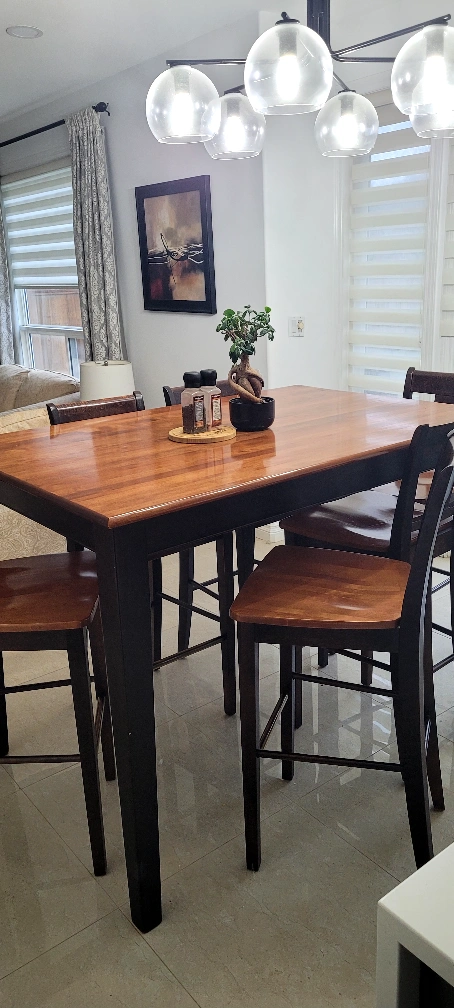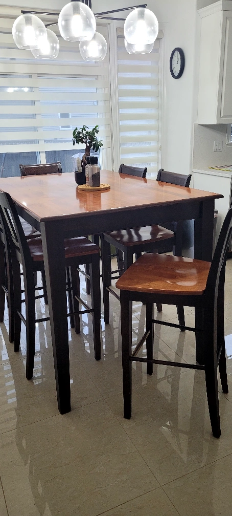 Solid wood kitchen table and six coordinating chairs. Dark brown legs and a light brown wood top. Excellent for smaller spaces and in excellent condition. height table 42", length 60", width 40" chairs 30"