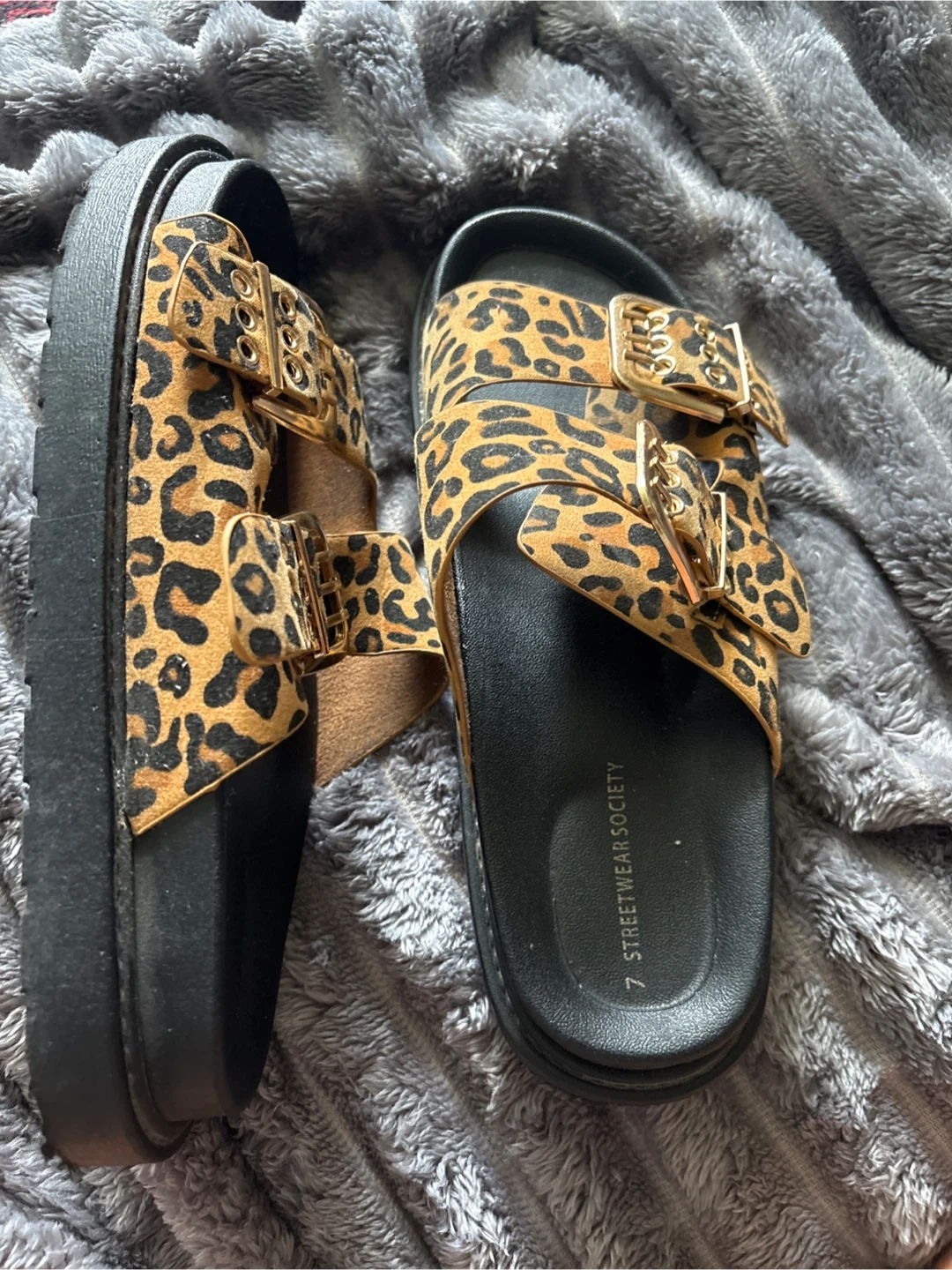 15Stylish leopard print sandals from 7 Streetwear Society. These sandals feature a comfortable platform sole and eye-catching gold buckle detailing. Perfect for adding a touch of flair to your summer wardrobe!