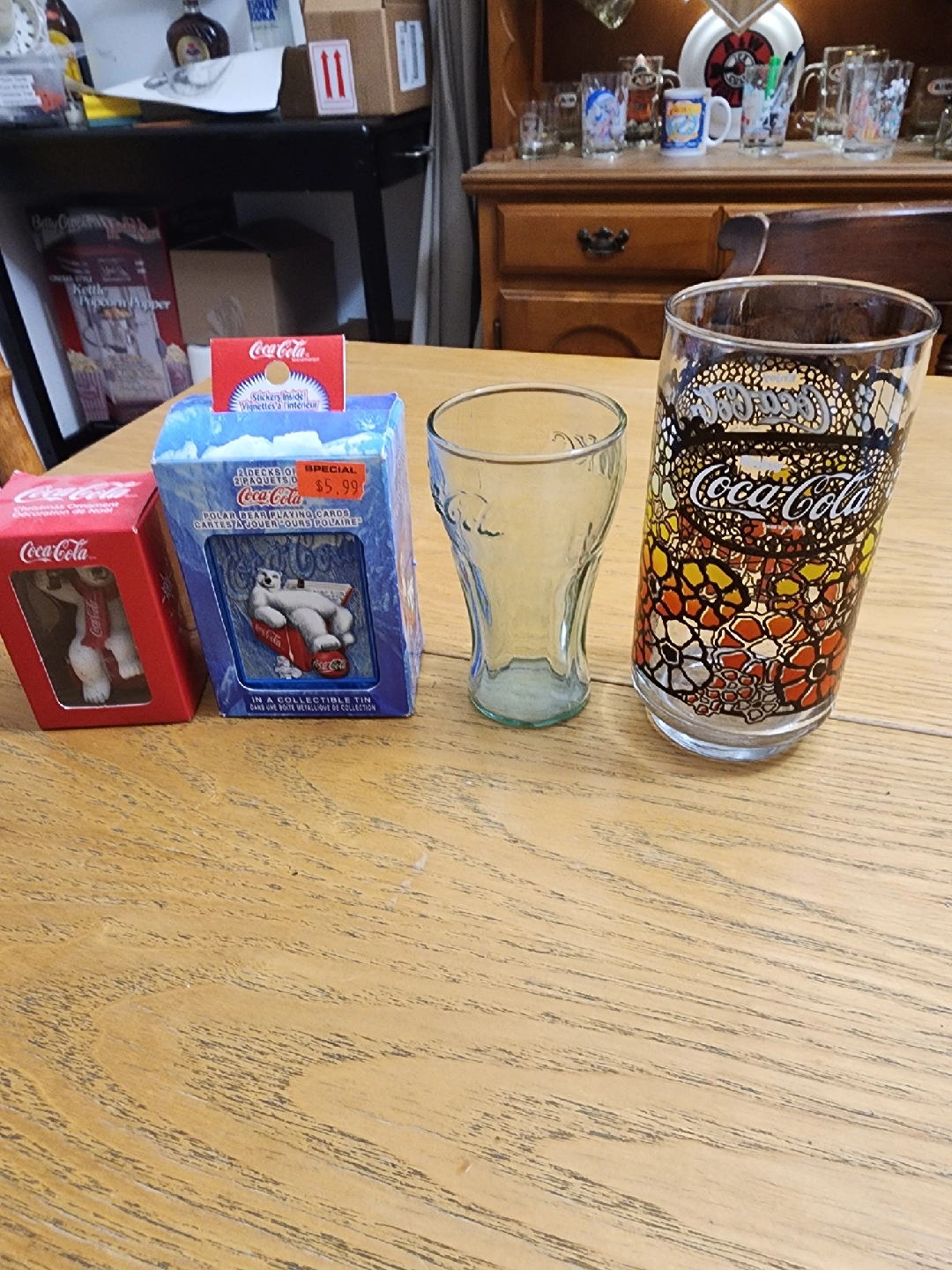 Selling a variety of Coca-Cola collectibles! There's a Christmas ornament, a deck of polar bear playing cards in a collectible tin (originally $5.99), and two Coca-Cola glasses