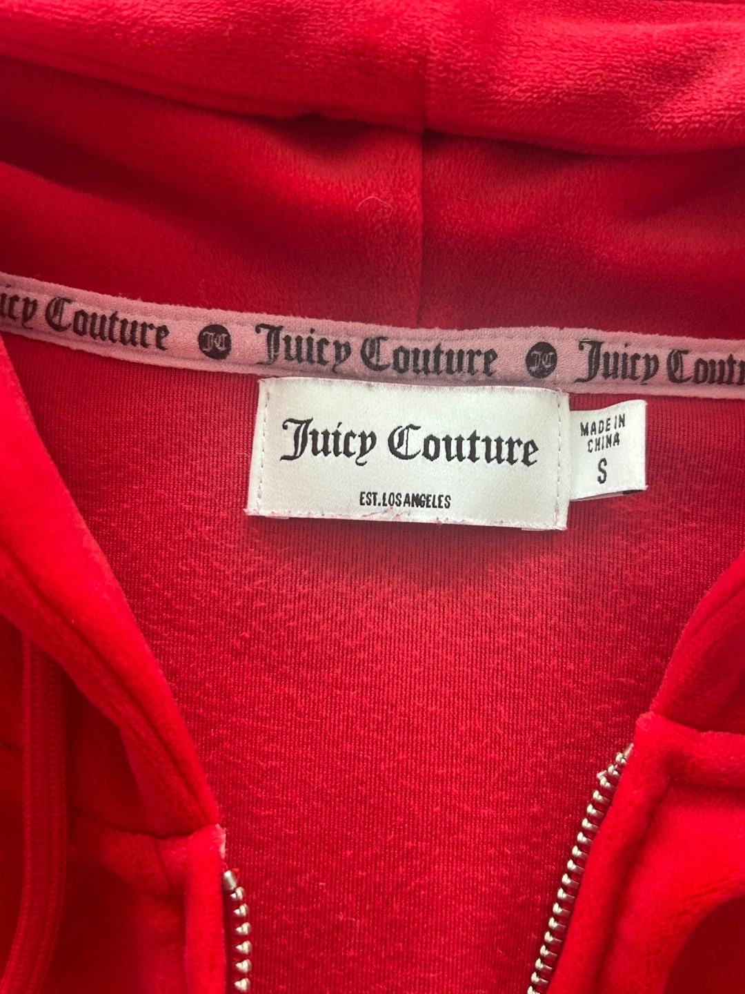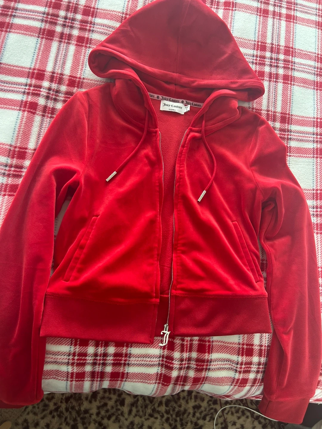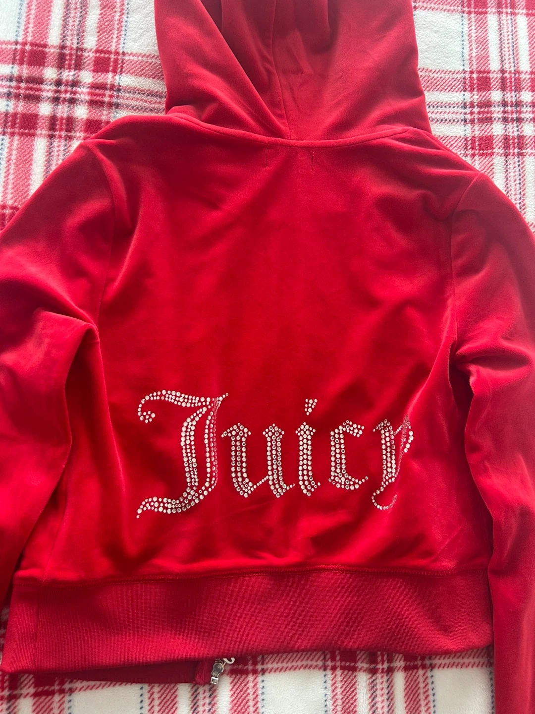 Selling a cute Juicy Couture red velour hoodie! It's in great condition and features the classic Juicy logo on the back in rhinestones. Size S.