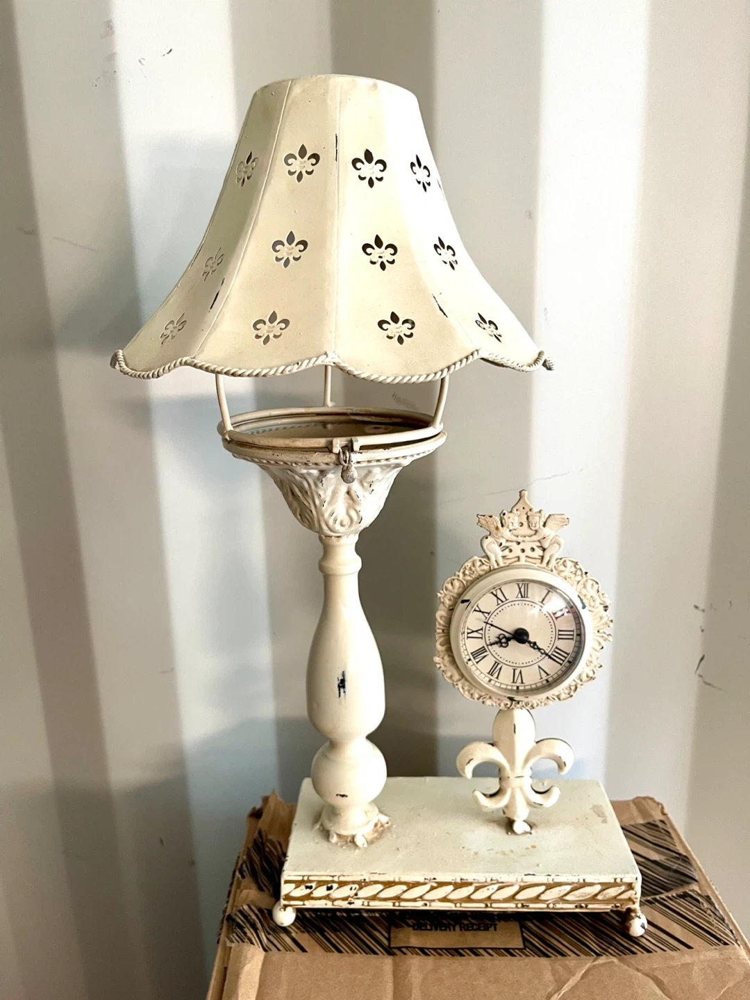 Selling a charming vintage-style table candle lamp. It features a decorative lampshade and an attached clock at the base. Perfect for adding a touch of elegance to any room!