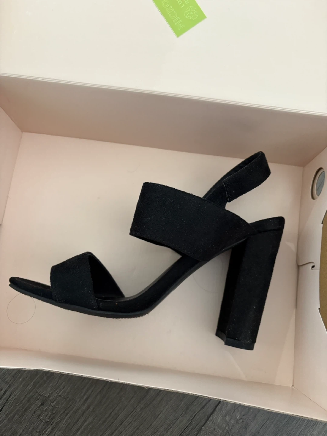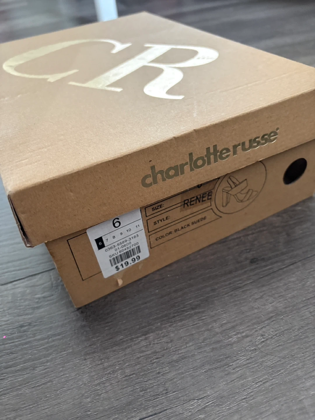 Selling a pair of Charlotte Russe Renee heels in black suede! They're a size 6 and come in the original box. The box says they were originally $19.99. These heels are super cute and ready for a new home
