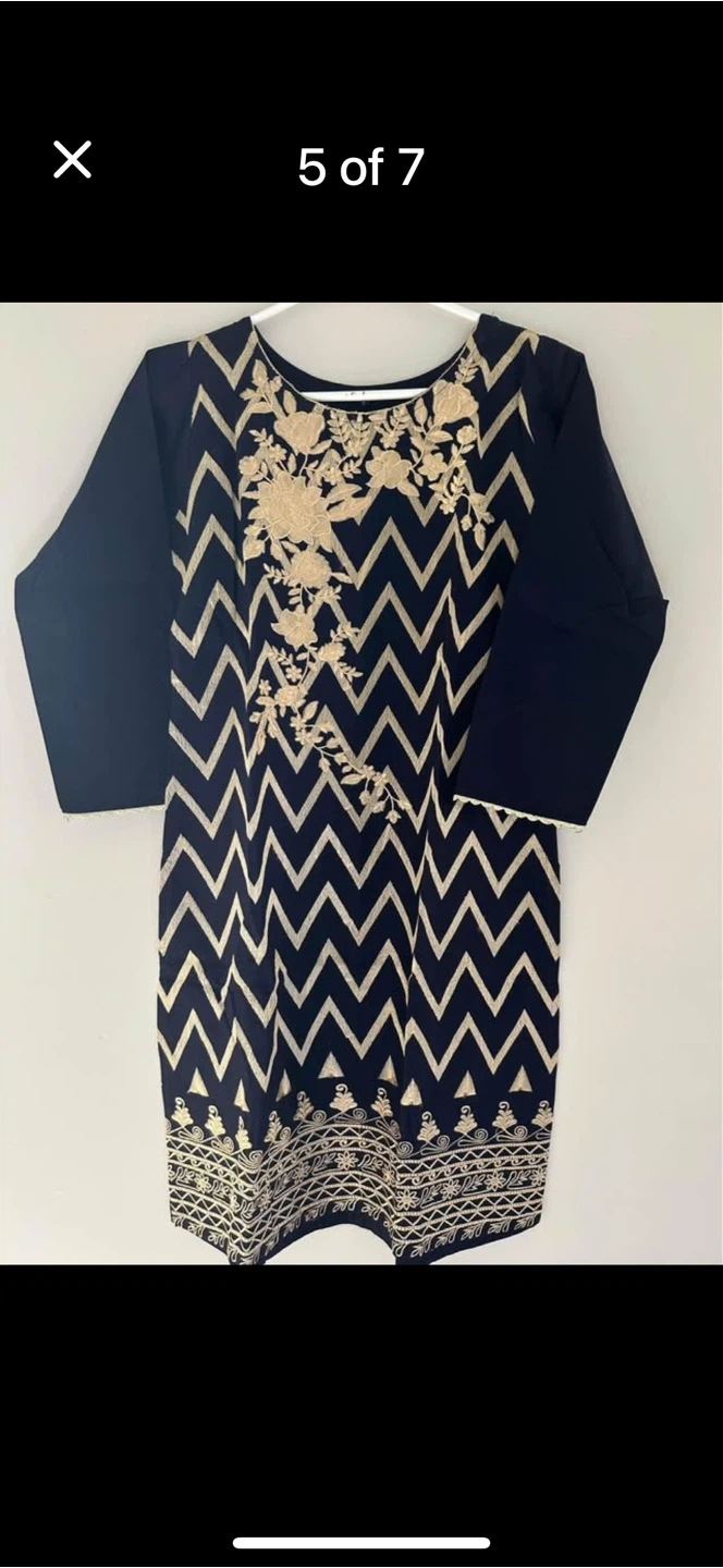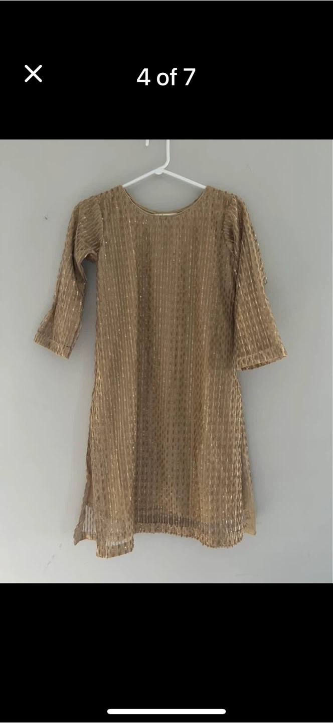 Selling a couple of beautiful party dresses. One is a gold/beige colour with sequins and the other is a black and gold colour with a zigzag pattern. Both are in great condition!