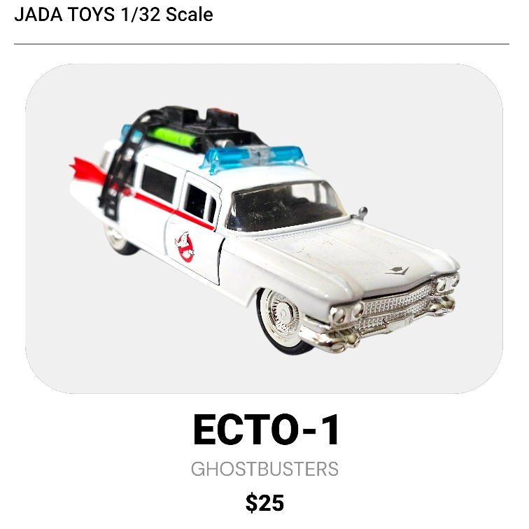 Selling a Jada Toys Ghostbusters Ecto-1 diecast car in 1/32 scale! It's a cool collectible for Ghostbusters fans. Originally priced at $25