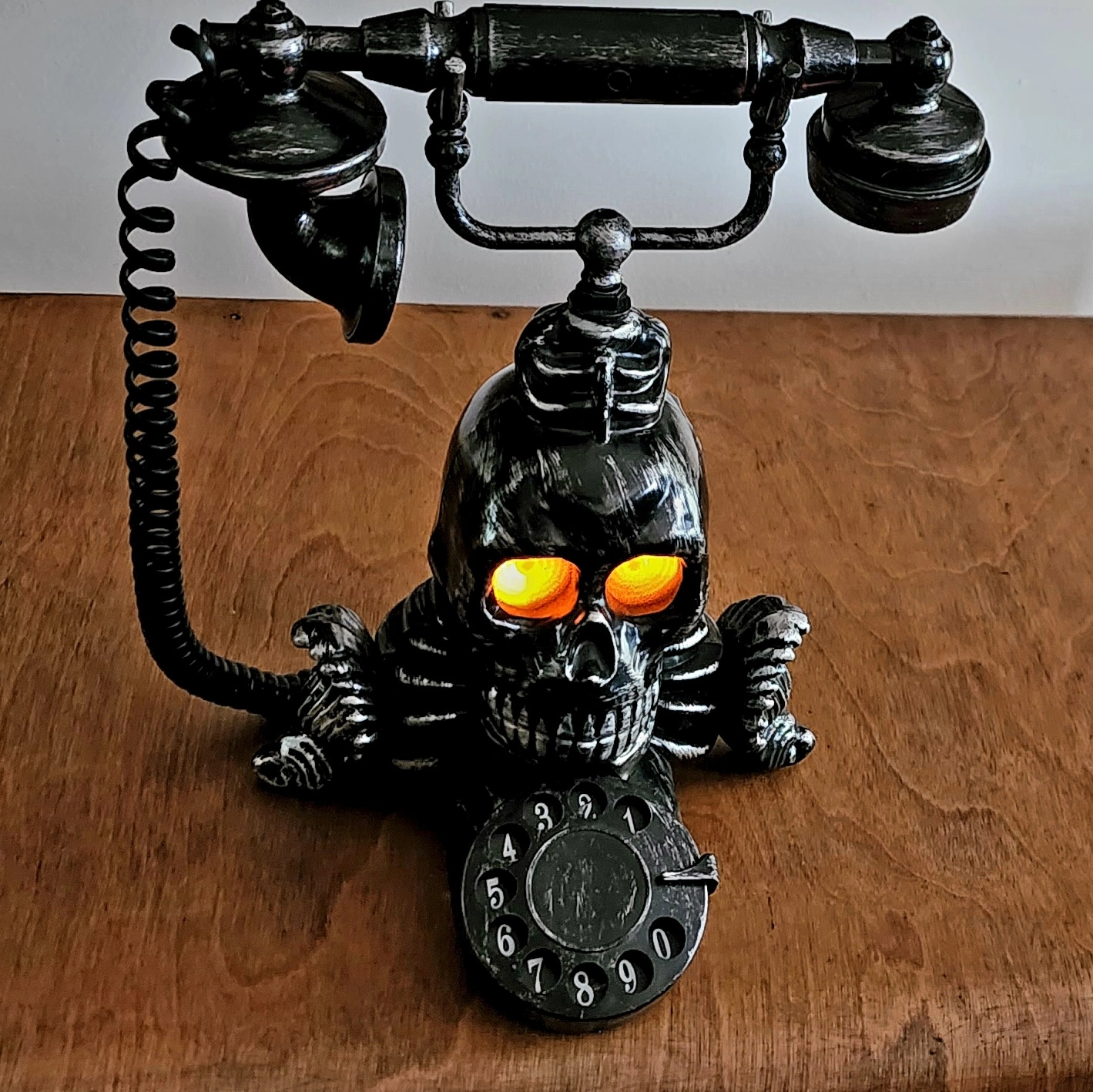 Spooky Halloween decoration! This is a skull telephone prop with light-up eyes. Great for adding a creepy touch to your Halloween decor
