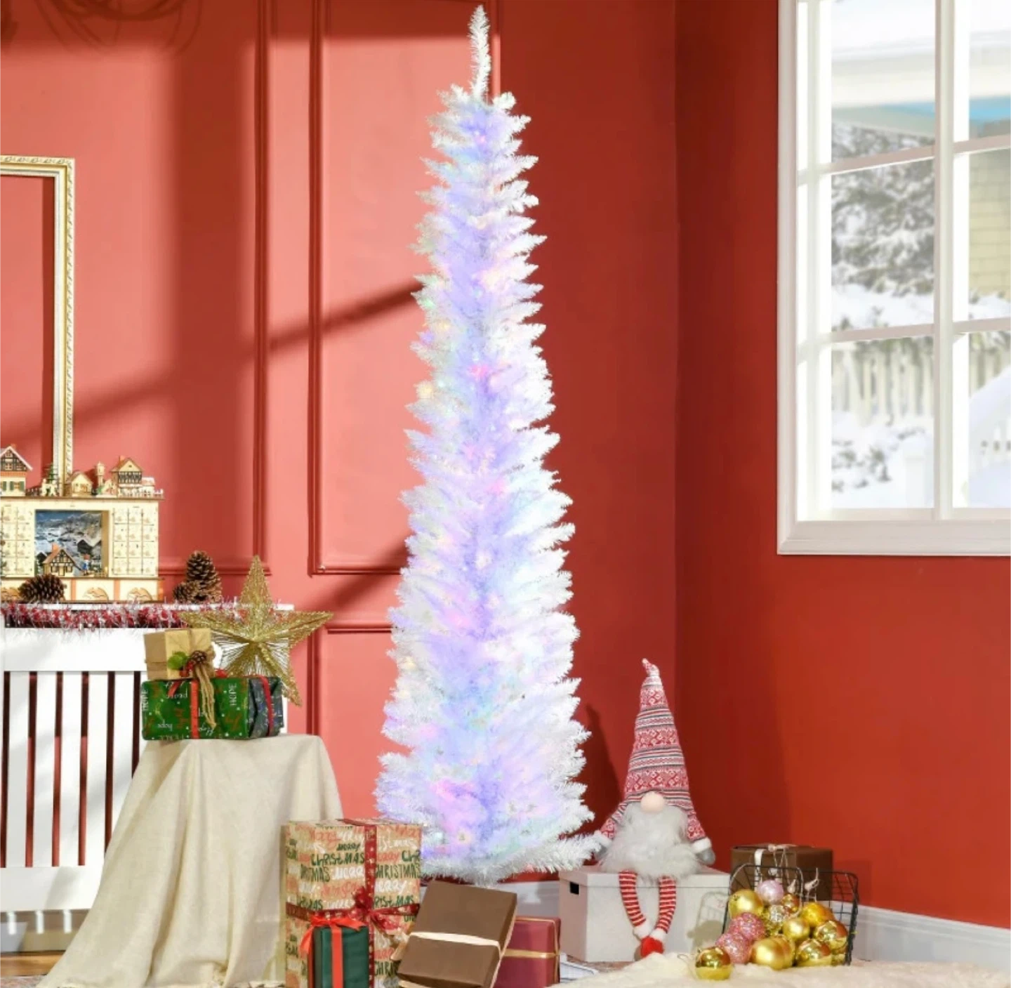 7' Prelit Christmas Trees, Pencil Artificial Christmas Tree with Colourful Surface Tips, Colourful LED Lights, White