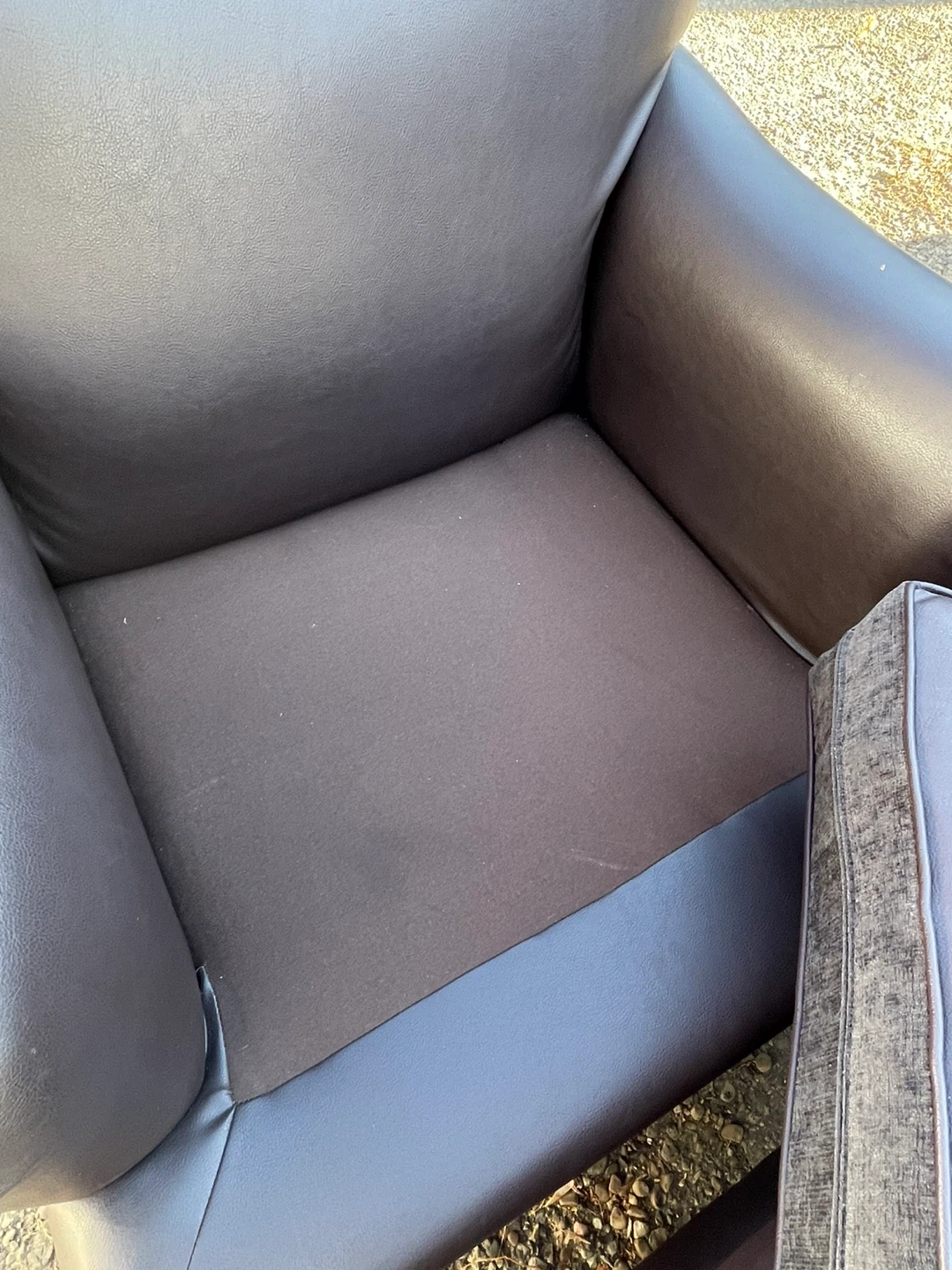 Excellent condition and very well made. FAUX leather pleather and brown in colour. This fabric shows great and have a few available. 35” wide by 42” deep. Come with matching Ottoman. Pick up or have it delivered.