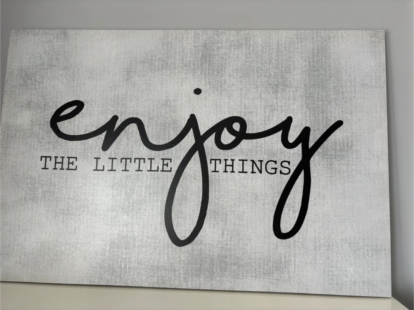 A lovely piece of wall art featuring the phrase "enjoy the little things" in black lettering on a grey background. It's in great condition and ready to add a touch of inspiration to your home decor