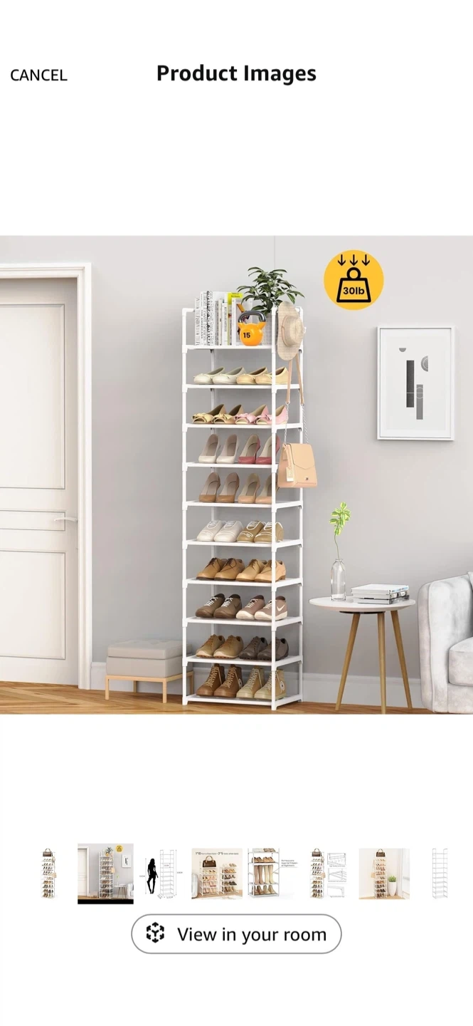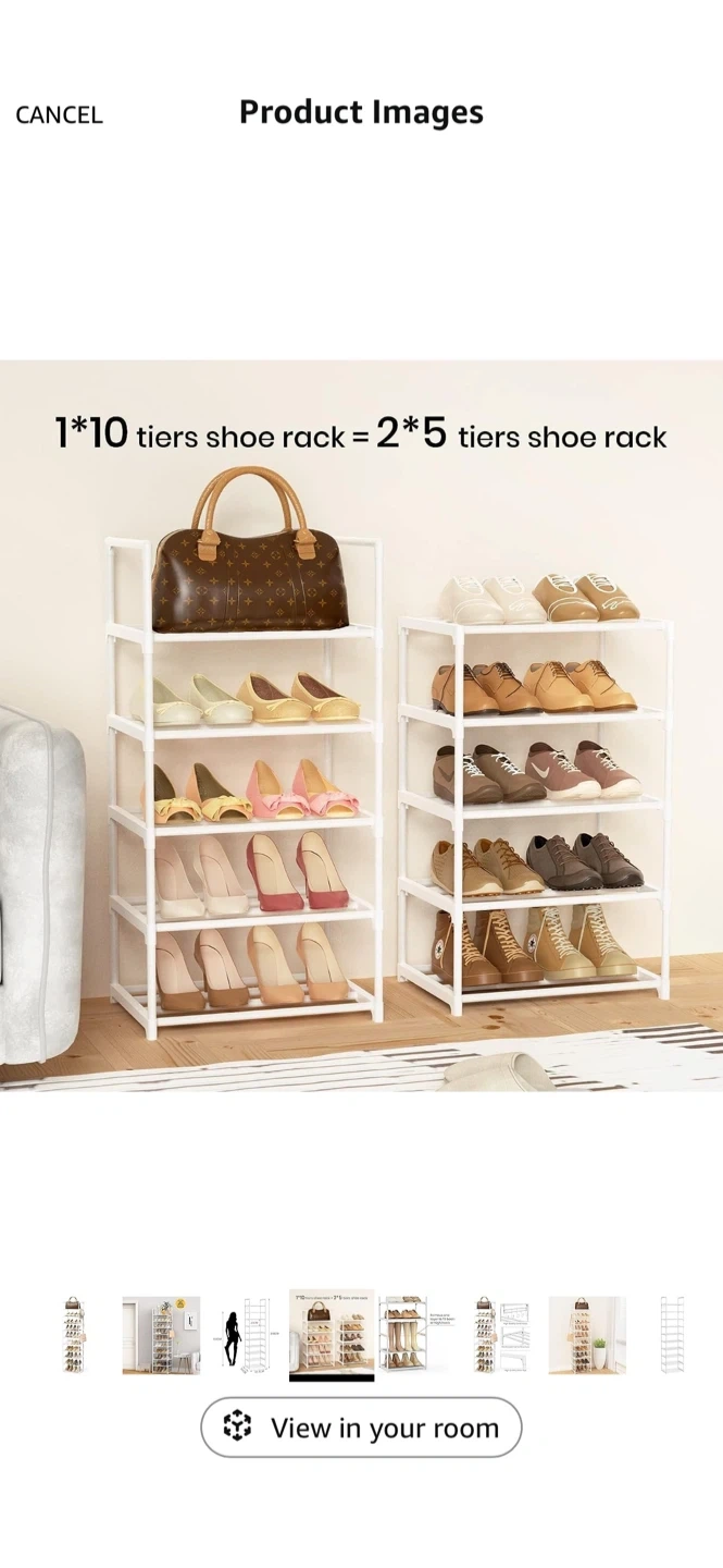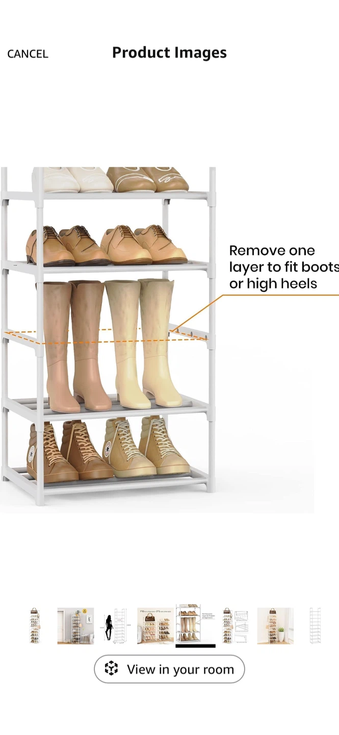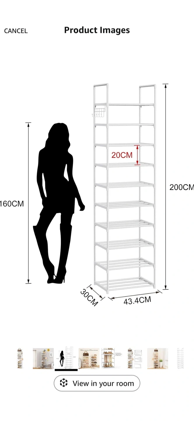 Selling a 10-tier shoe rack organizer! It can be configured as a 2x5 tier rack. Each layer is removable to fit boots or high heels. It measures 160cm tall, 43.4cm wide, and 30cm deep, with 20cm between each layer. It can hold up to 30lbs