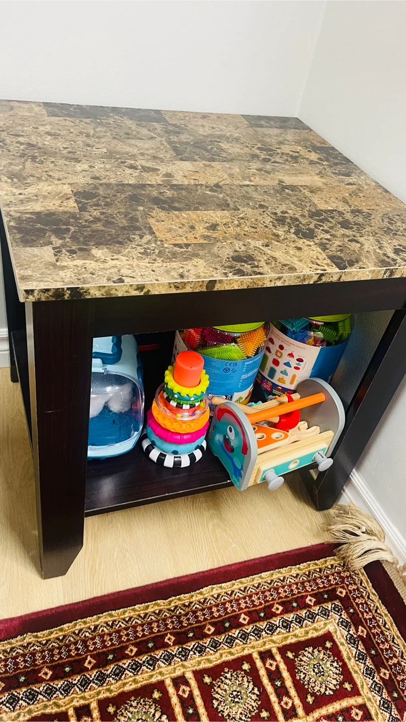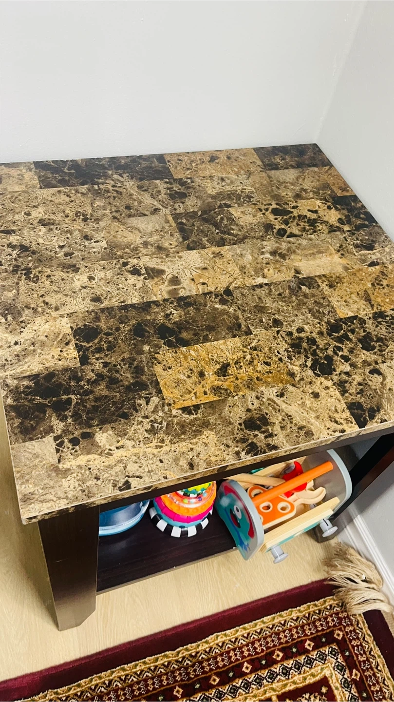 10This is a coffee table in good condition. It has a faux marble top and a dark brown frame. There's a shelf underneath for some extra storage too! It measures approximately 64 cm in length and width, and it stands about 49 cm tall