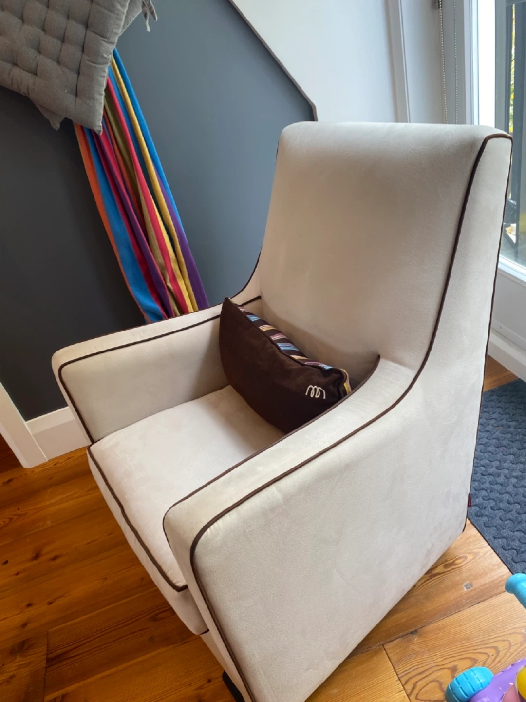 Selling a comfy cream-coloured swivel glider chair with a matching ottoman! The chair has a smooth gliding motion, perfect for relaxing. It comes with a brown accent pillow for extra coziness. Great for a nursery or living room and it’s also a rocker . Grande monte LUCA GLIDER goes for over 1795 https://montedesign.ca/products/modern-nursery-glider