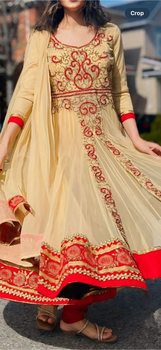 10Beautiful cream and red Anarkali dress with intricate embroidery. Perfect for special occasions or cultural events! The dress features detailed patterns and a flowing design.