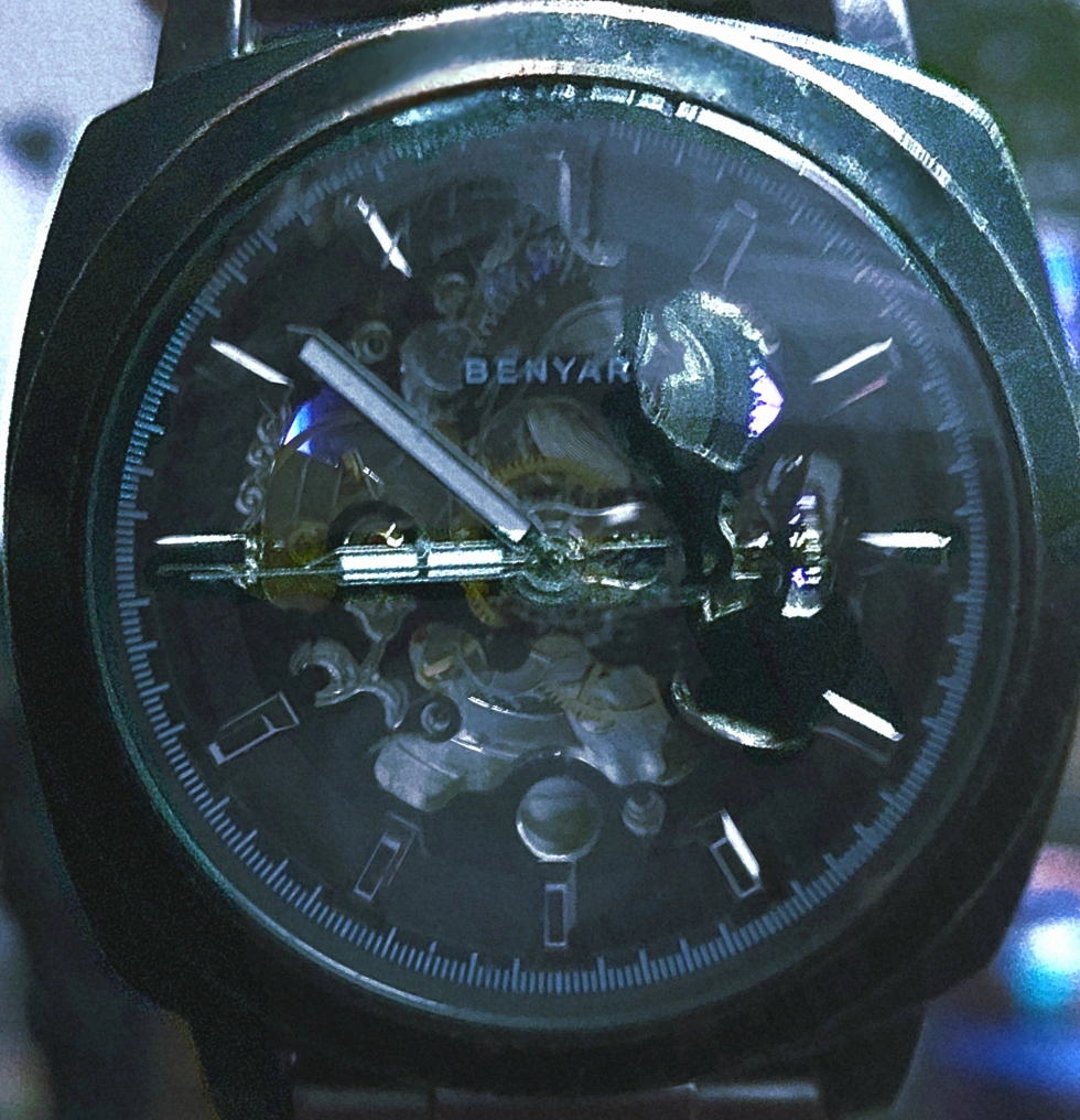 Selling a Benyar automatic watch in black. It's in good condition and has a unique skeleton dial that shows the inner workings of the watch. It has a metal band and a rugged look.