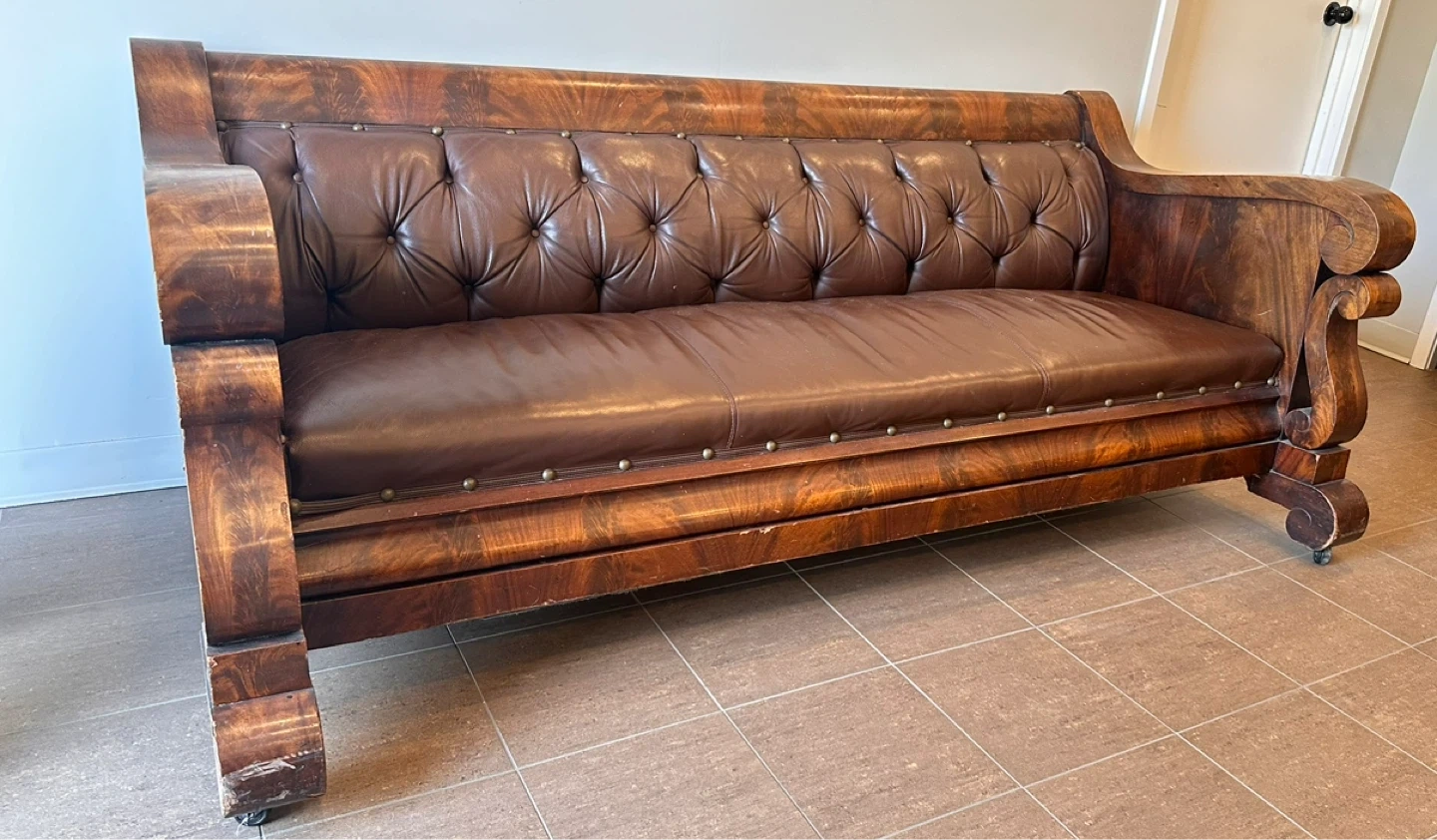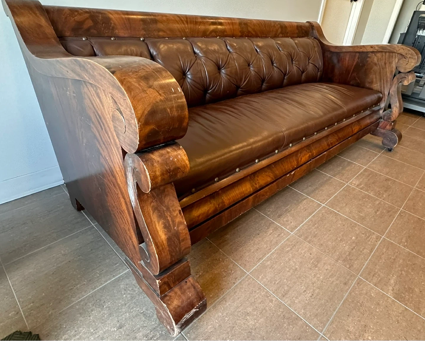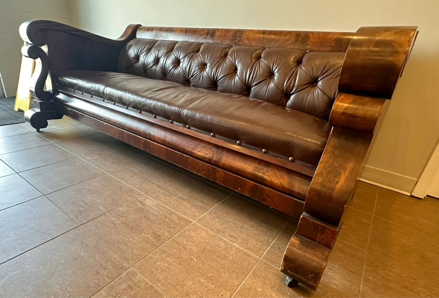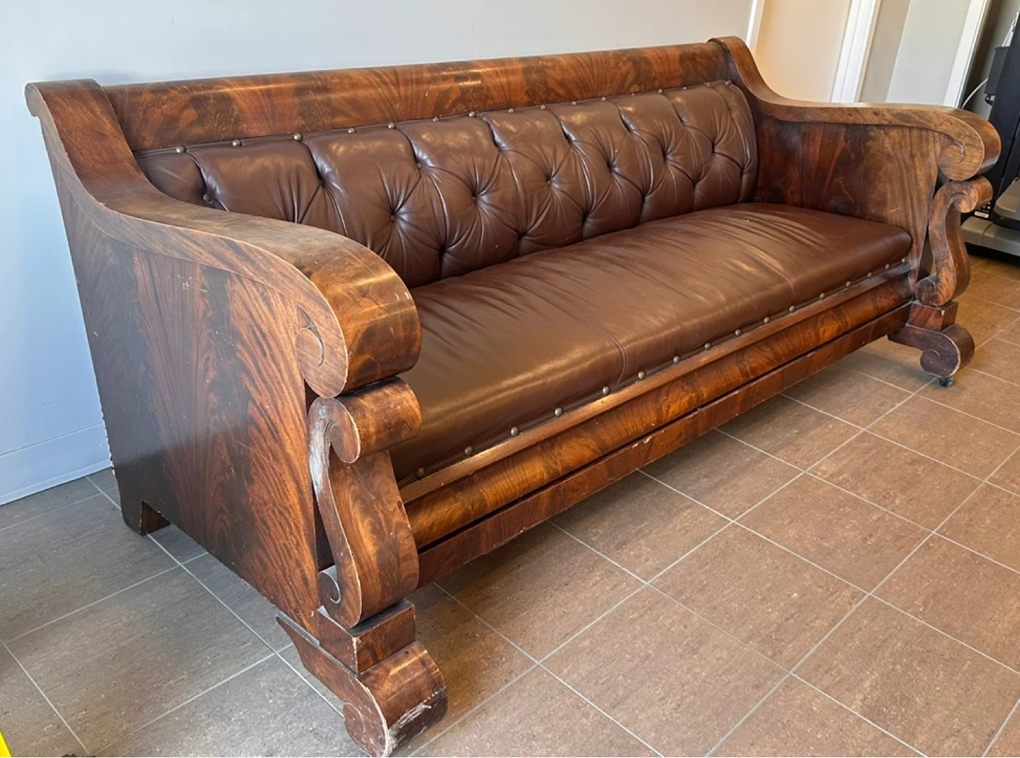Check out this stunning antique sofa! It features a beautiful brown leather seat with button tufting and a rich, dark wood frame. Perfect for adding a touch of elegance to any living space Own a piece of history with this stunning Empire-style vintage sofa from the 1840s. A true collector's item, this American-made antique is crafted with solid mahogany wood and genuine leather upholstery, making it a timeless statement piece for any home. ✨Exquisite burled mahogany veneer detailing + Elegant tufted leather back for a classic look Rich, deep seating for luxurious comfort Dimensions: 85" L x 38" D x 31" H (Seat Depth: 20") Available for pick-up in Edmonton