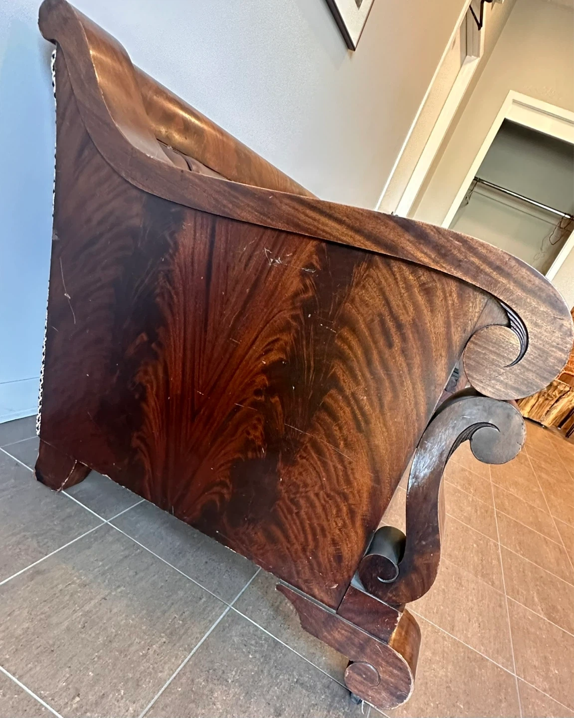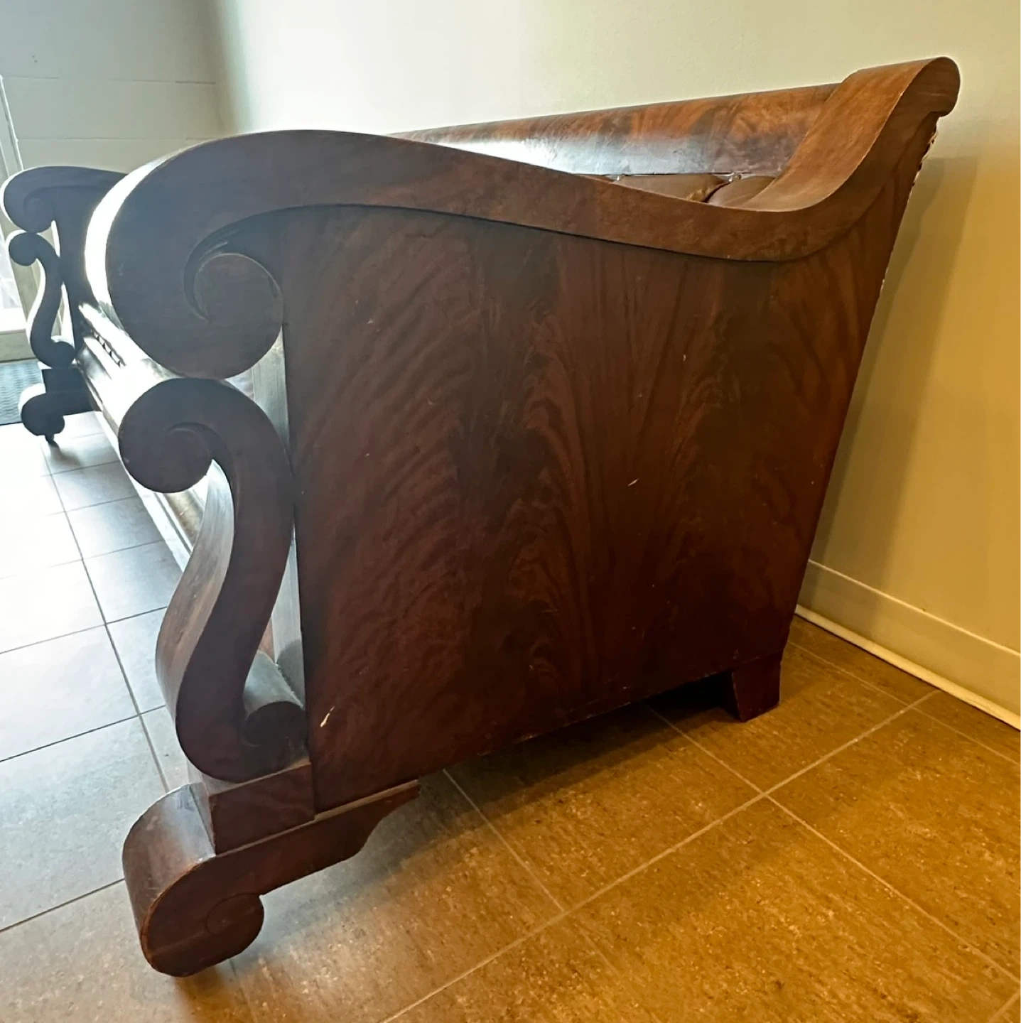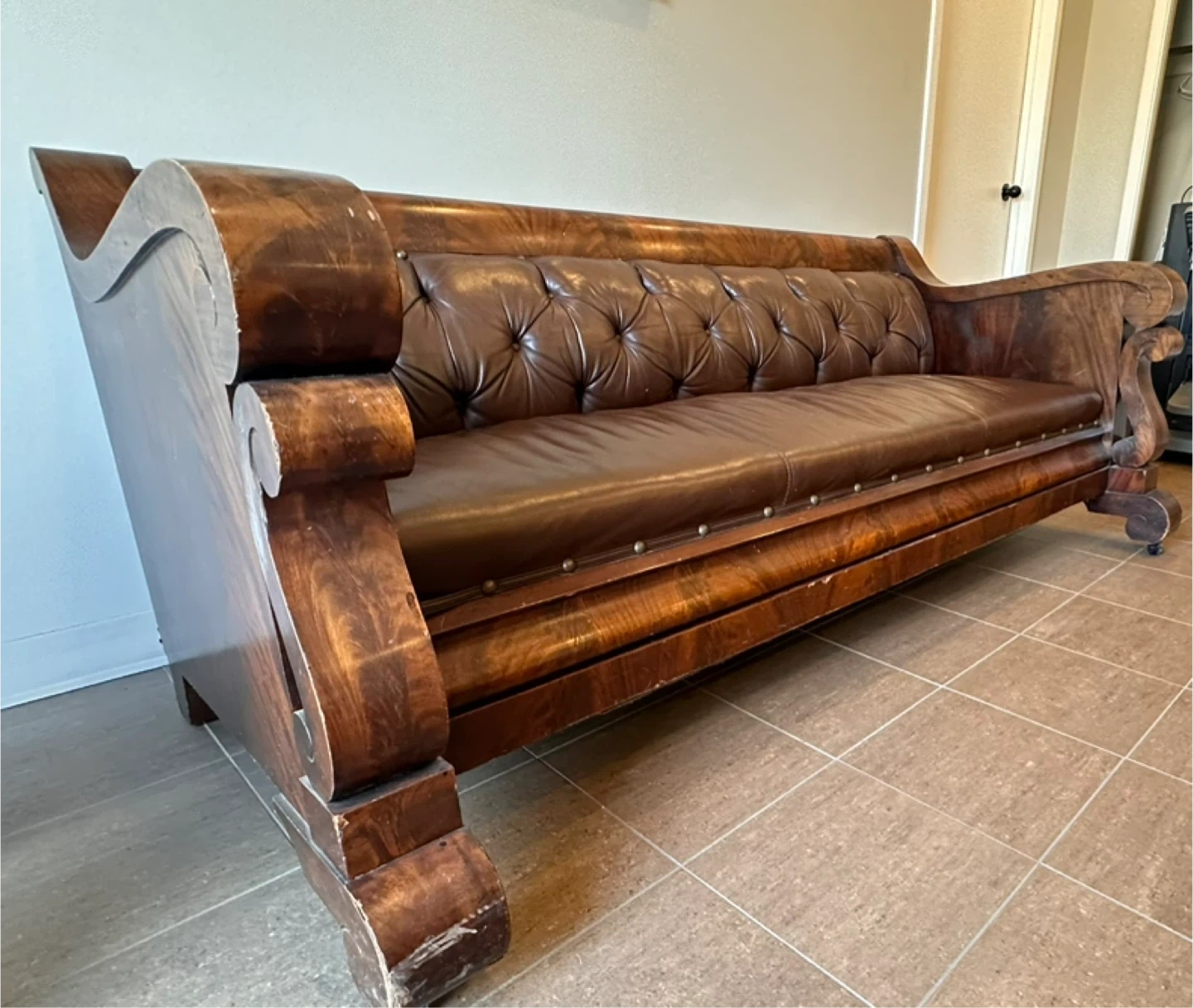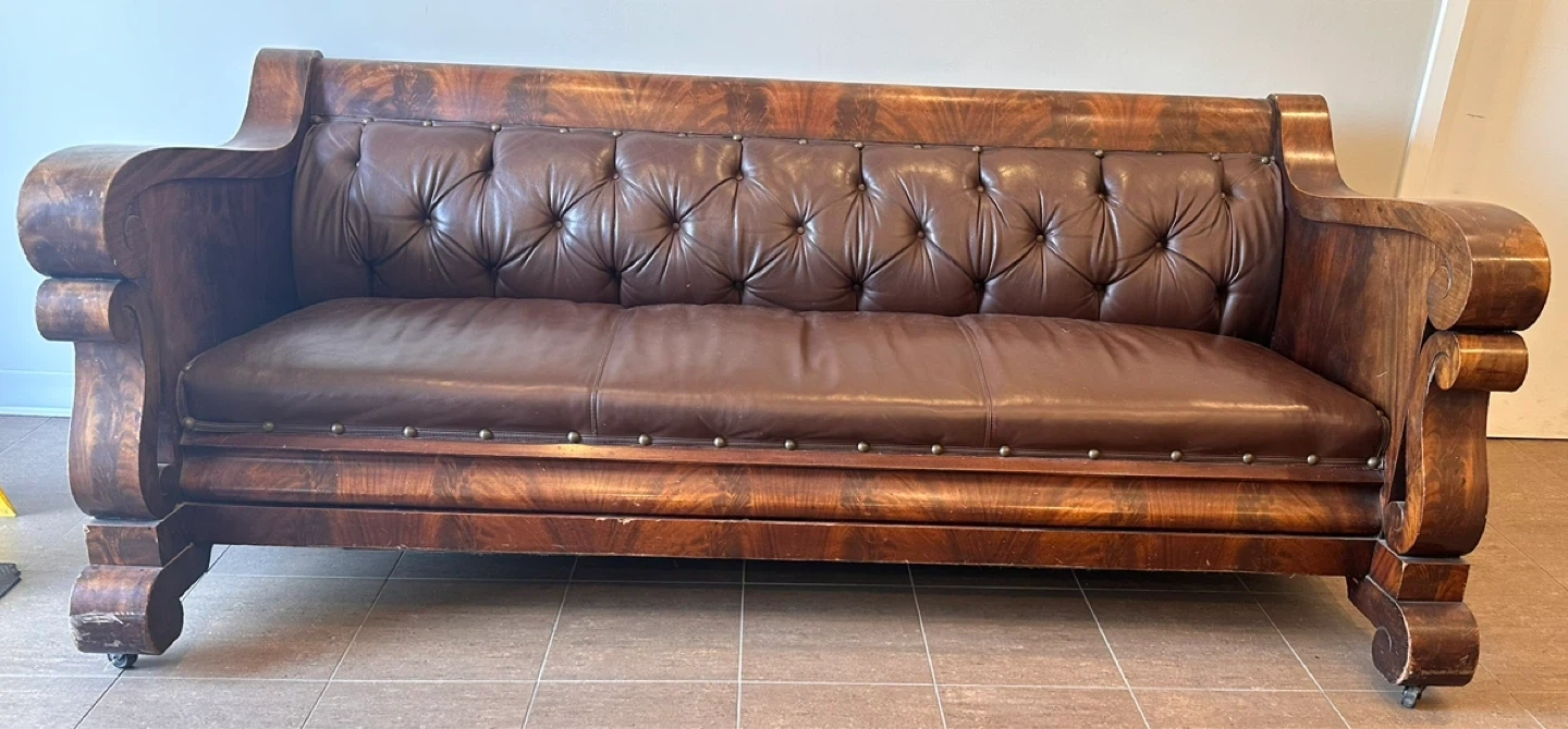 Check out this stunning antique sofa! It features a beautiful brown leather seat with button tufting and a rich, dark wood frame. Perfect for adding a touch of elegance to any living space Own a piece of history with this stunning Empire-style vintage sofa from the 1840s. A true collector's item, this American-made antique is crafted with solid mahogany wood and genuine leather upholstery, making it a timeless statement piece for any home. ✨Exquisite burled mahogany veneer detailing + Elegant tufted leather back for a classic look Rich, deep seating for luxurious comfort Dimensions: 85" L x 38" D x 31" H (Seat Depth: 20") Available for pick-up in Edmonton