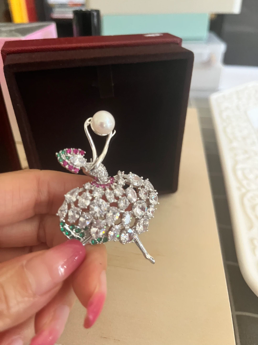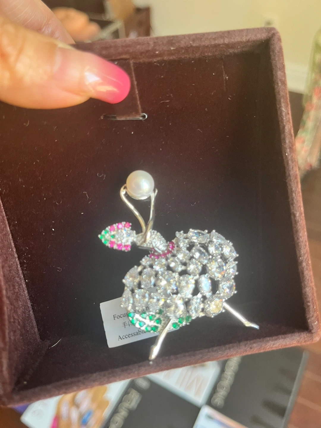 Selling a lovely AkiaWhere ballerina brooch. It features a pearl accent and is adorned with sparkling stones. Comes with its original box!