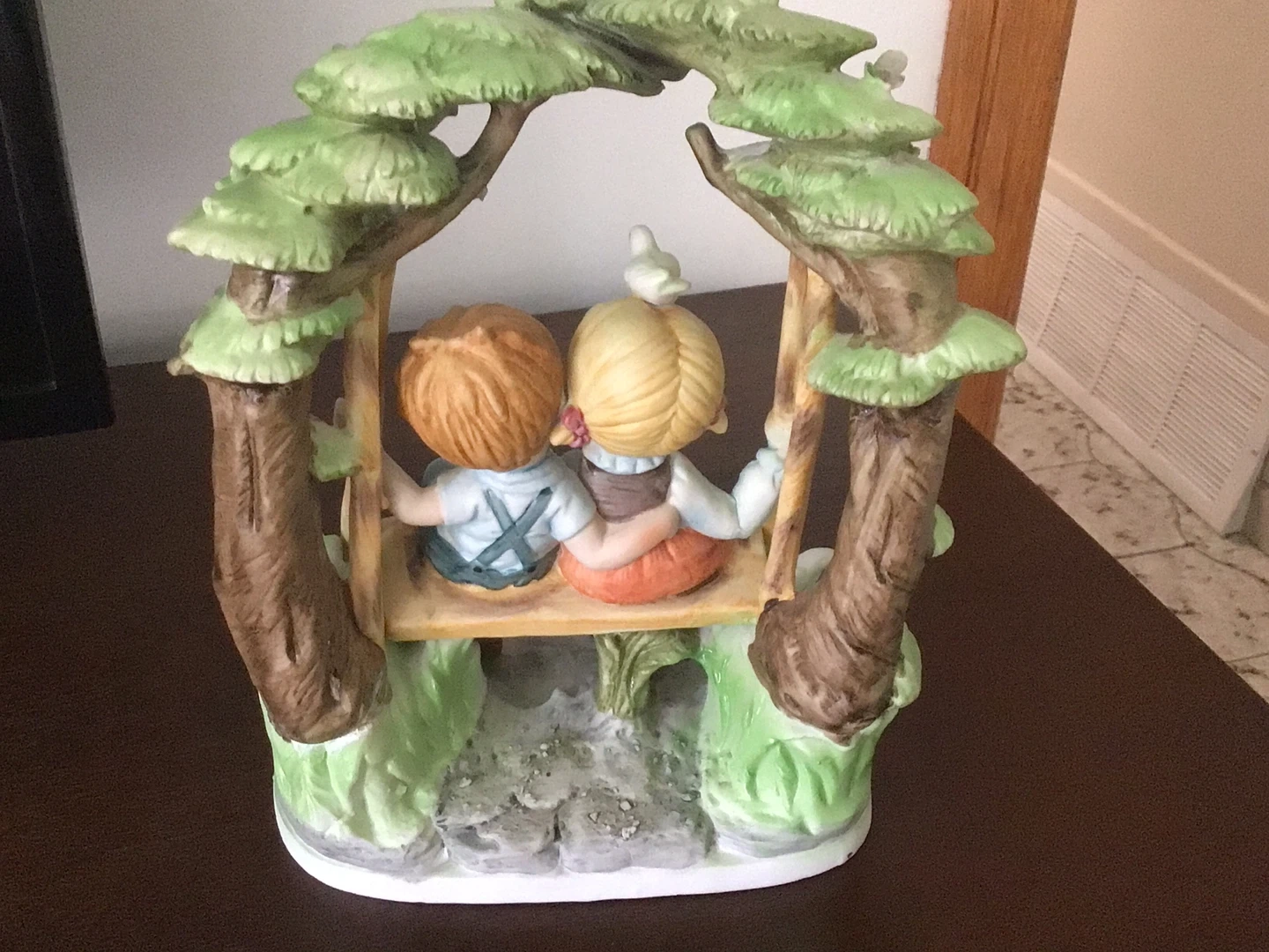 This is a cute vintage figurine of a boy and girl sitting on a swing. It's in great condition and would be a sweet addition to any collection or decor