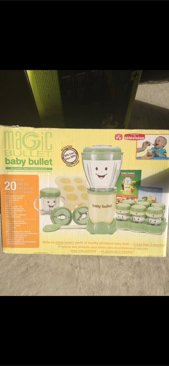 10Selling a Magic Bullet Baby Bullet, the complete baby food making system! It comes with a 20-piece set, including a high-torque power base, stainless steel blades, batch bowls, storage cups, and more. Make an entire week's worth of healthy all-natural baby food in less than 5 minutes