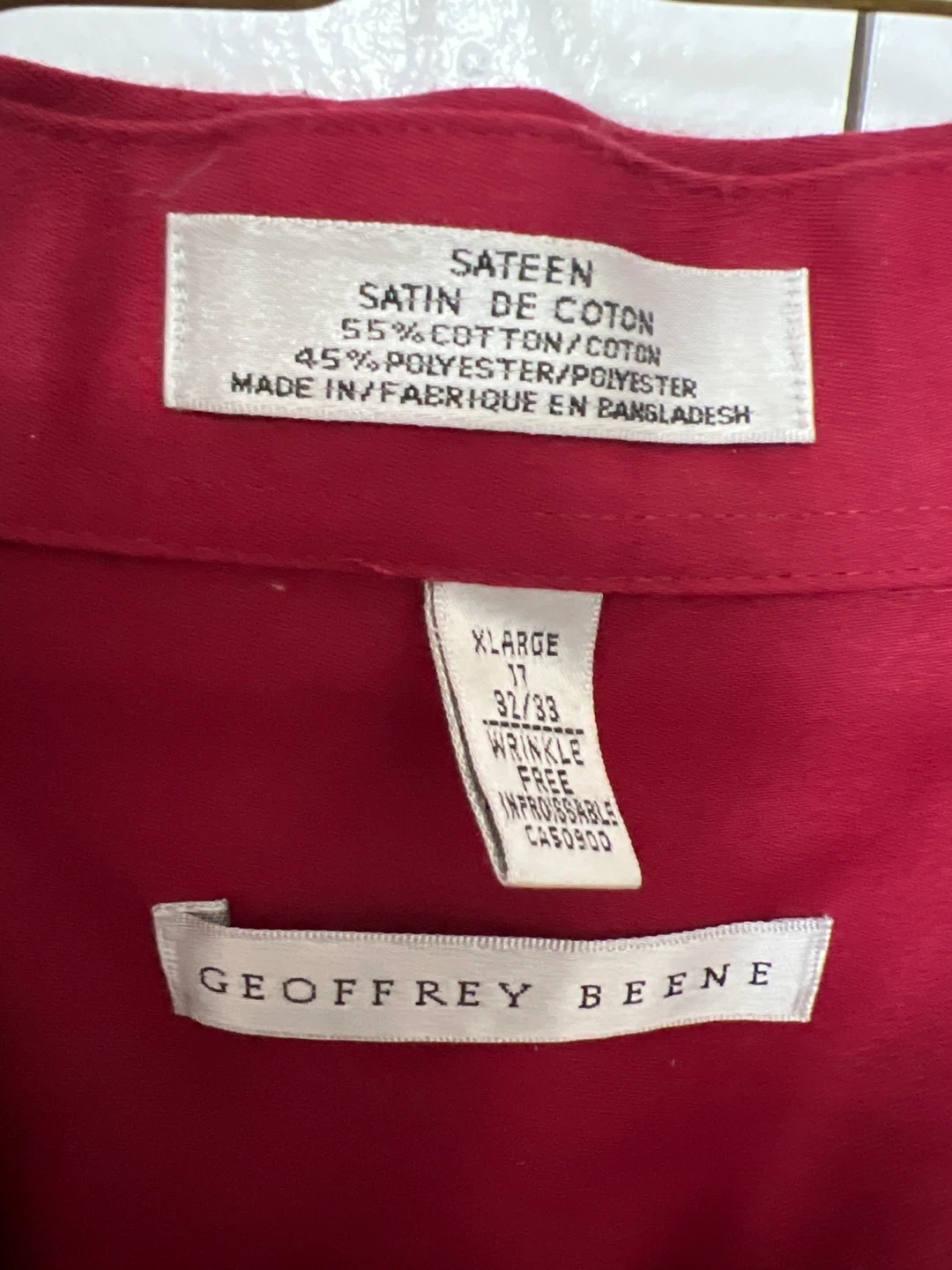 21Selling a Geoffrey Beene dress shirt in a lovely red colour. It's an XLarge and made of 55% cotton and 45% polyester. The shirt is wrinkle-free, so it's super easy to care for!