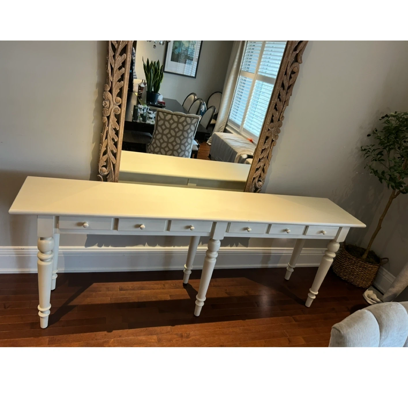 Selling a lovely white console table! It features a 6 drawers, perfect for adding some extra storage to your space. It's in good shape and ready for a new home!