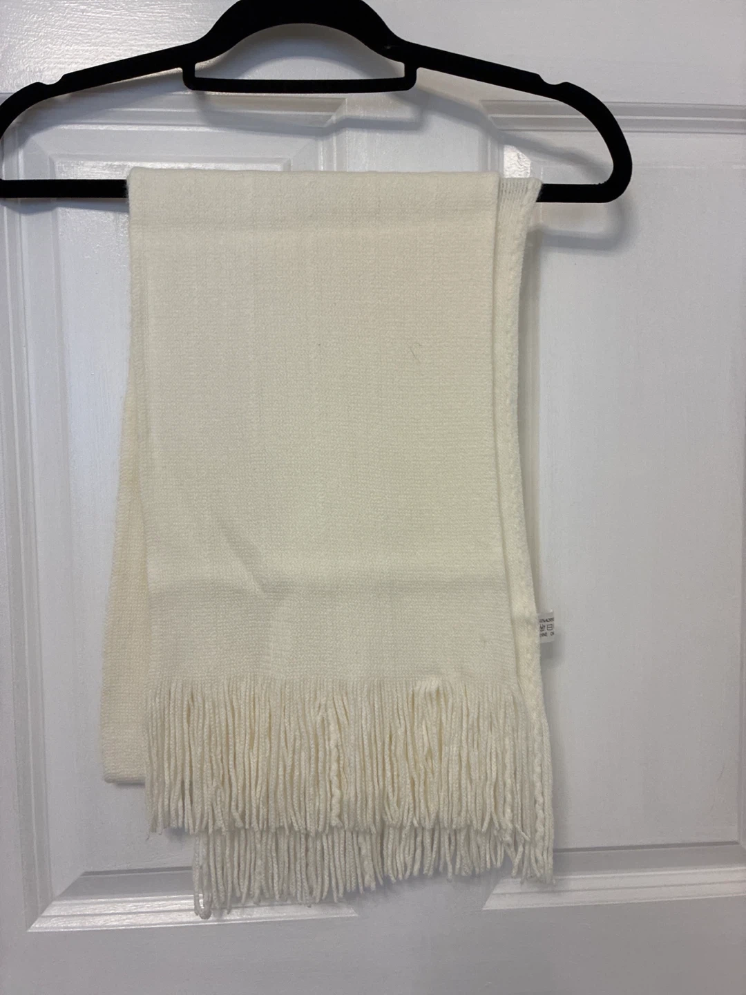 A cozy cream-coloured knit scarf is up for grabs! It's in great condition and ready to keep you warm. The scarf features a classic knit pattern and stylish fringe detailing, perfect for adding a touch of elegance to any outfit. It's a versatile accessory that can be dressed up or down, making it a great addition to your winter wardrobe