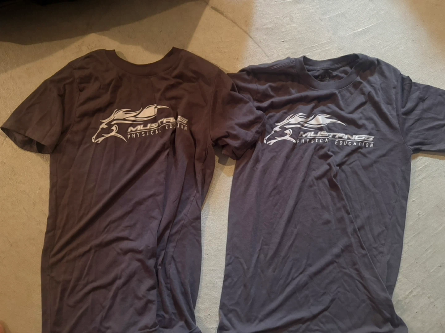 10Two Mustangs Physical Education T-shirts available. They are in good condition and ready for a new home!