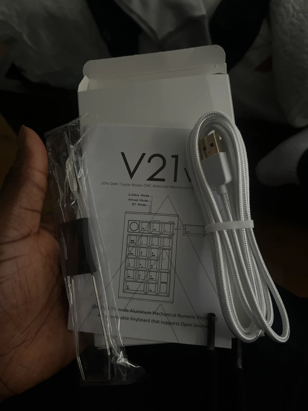 Selling a brand new V21v2 20% GMK Triple Modes CNC Aluminum Numeric Keyboard! It comes with the box and included components like the cable. This keyboard supports multiple modes, including 2.4Ghz, wired, and Bluetooth. It's a remarkable keyboard that supports Open Source