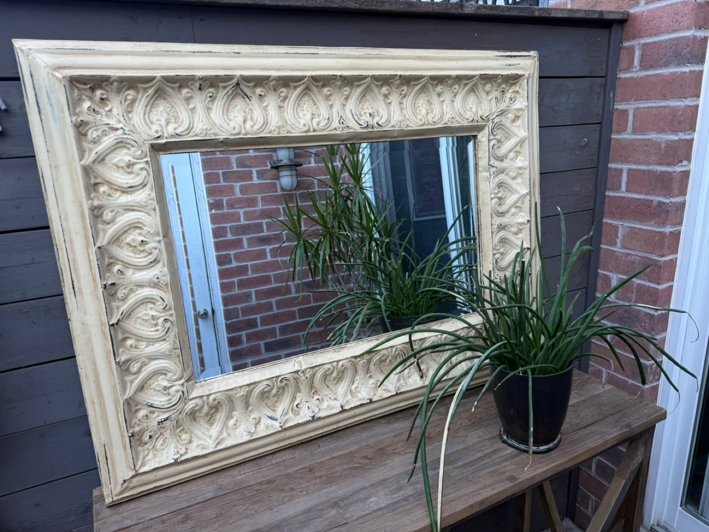 Selling a Rustic (Reclaimed Tin Ceiling) Framed Beveled Mirror! It's in great condition and would add a touch of elegance to any room. The mirror has a strong wire attachment to the back for easy hanging and can also be switched to hang vertically if preferred.