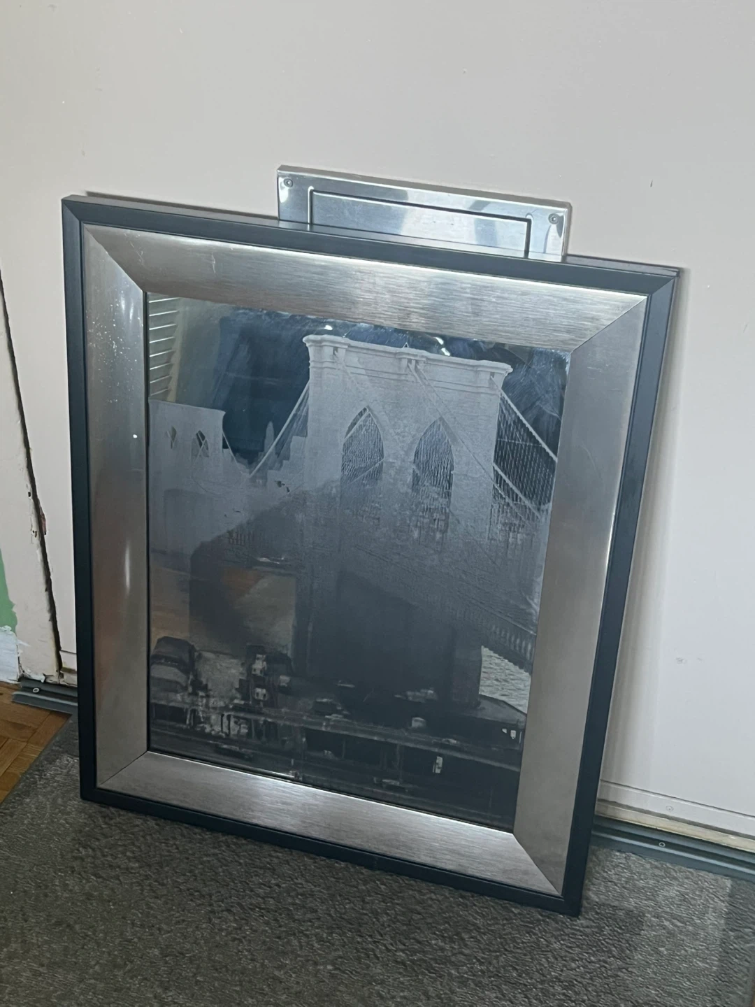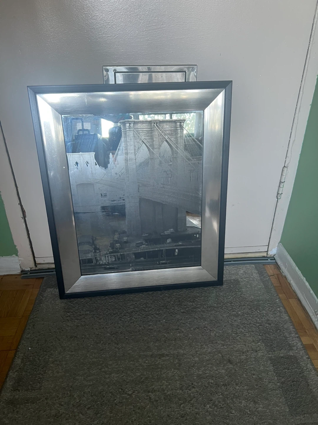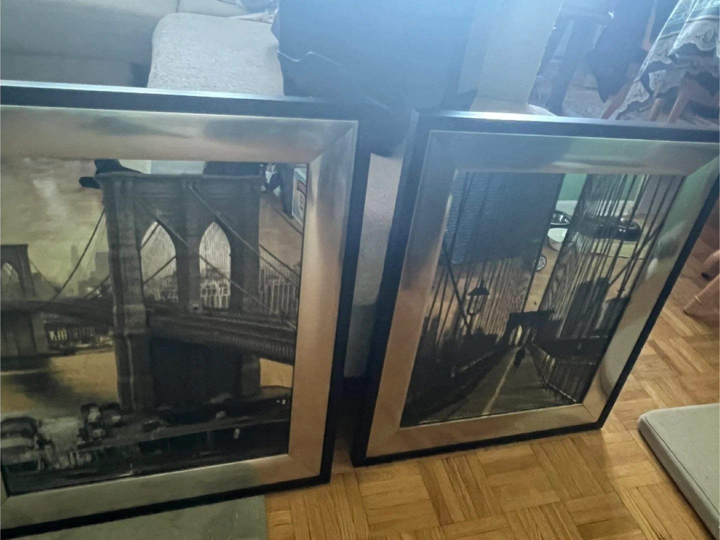 Selling two framed 16x20 mirror art decor pieces. They feature a bridge design and have a silver and black frame. They are in good condition and ready to add a touch of elegance to your space($12 for both.)