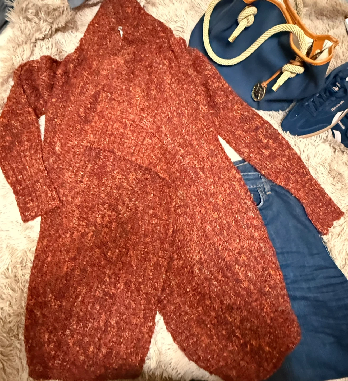 Cozy up with this lovely knitted open front cardigan! It's a beautiful rust colour and perfect for layering on those chilly days. Size small, but nuns a bit oversized.It's in great condition and ready for a new home