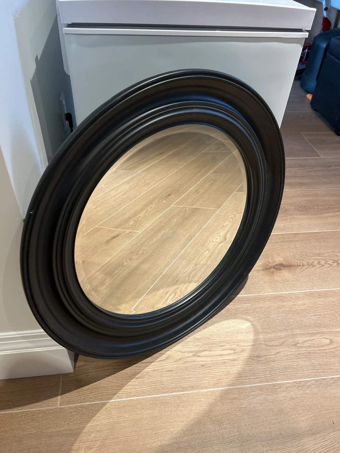 Selling a round wall mirror with a dark brown frame! It's in great condition and ready to add a stylish touch to your home. The mirror is easy to hang and will look great in any room