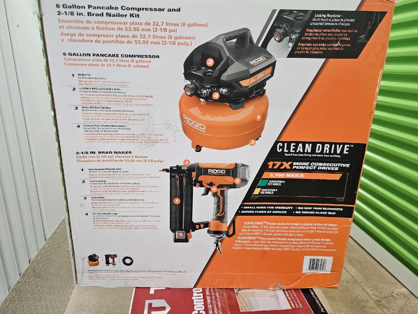 Selling a Ridgid 6 Gallon Pancake Compressor and 2-1/8in Brad Nailer Kit! This combo is perfect for various projects around the house. The compressor has a 6-gallon capacity, and the nailer accepts 2-1/8 inch brad nails. It also features Clean Drive Technology for more consistent results used for one job on my base boards no use for it now