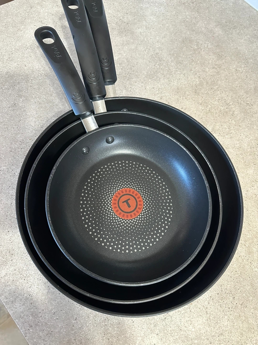 Selling a set of three T-fal non-stick fry pans! These pans are in great shape and ready for your next culinary adventure. They feature the classic T-fal red spot indicator to let you know when the pan is perfectly preheated. A great addition to any kitchen!