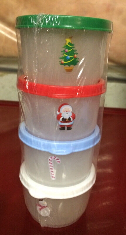 Christmas food storage containers for sale. New, sealed in plastic. Four mini 3” diameter plastic food storage containers with Christmas tree, Santa, candy cane, and snowman. Great for snacks, lunches, candy, gifts, and more. $5/set. Near the Burlington/Oakville border.