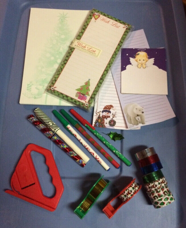 Christmas stationery and gift wrapping supplies for sale. 9 rolls of Christmas tape and two dispensers I don’t think were ever used, wrapping paper cutter, 5 Christmas pens working and three new I think, green tree notepad, new sealed wish list magnetic notepad, and small amount on angel, polar bear, and snowman notepads. Great for Christmas gift wrapping, home or office supplies, school supplies, and more. All for $8. Near the Burlington/Oakville border. No delivery.