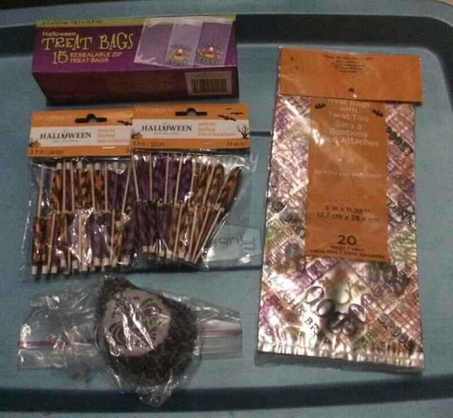 Halloween baking and entertaining supplies for sale. Most new, sealed. 20-pk sealed cello treat bags with words like “boo”, sealed box of 15 zip seal treat bags with trick-or-treat candy corn, two 24-pk sealed cocktail drink umbrellas with orange or purple and black stripes, and open package of grey fancy skull cupcake papers/liners. Great for Halloween, gothic-themed party, trick-or-treating, and more. All for $12. Near the Burlington/Oakville border. No delivery.