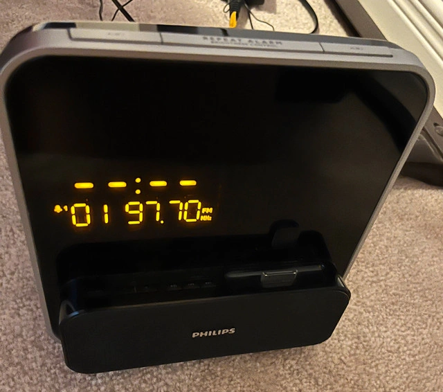 iPod/iPhone 30-pin alarm clock radio MP3 stereo for sale. Fits older, wider-connector Apple devices. Dock for iPod or iPhone has an adjustable support. With line in, radio, presets, 2 alarms, adjustable brightness, and more. Philips brand. Works. $35. Near the Burlington/Oakville border.