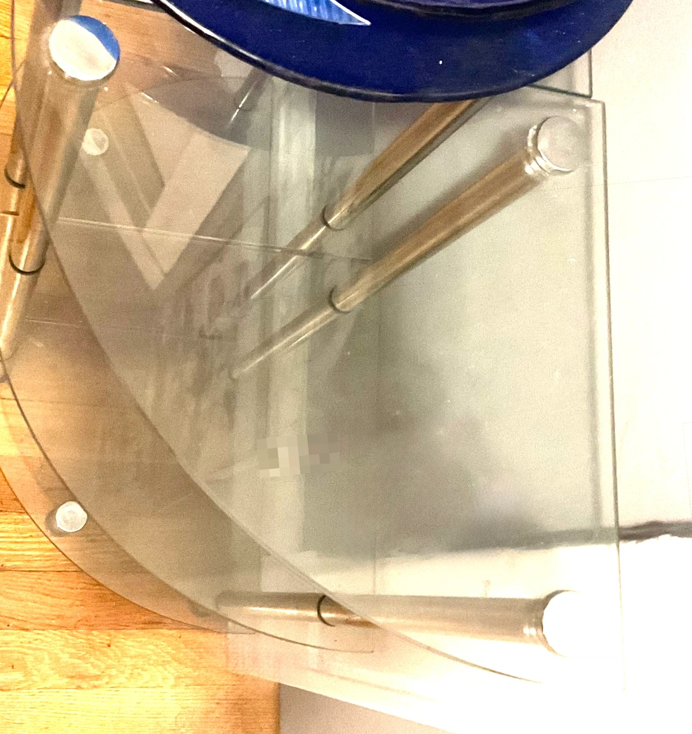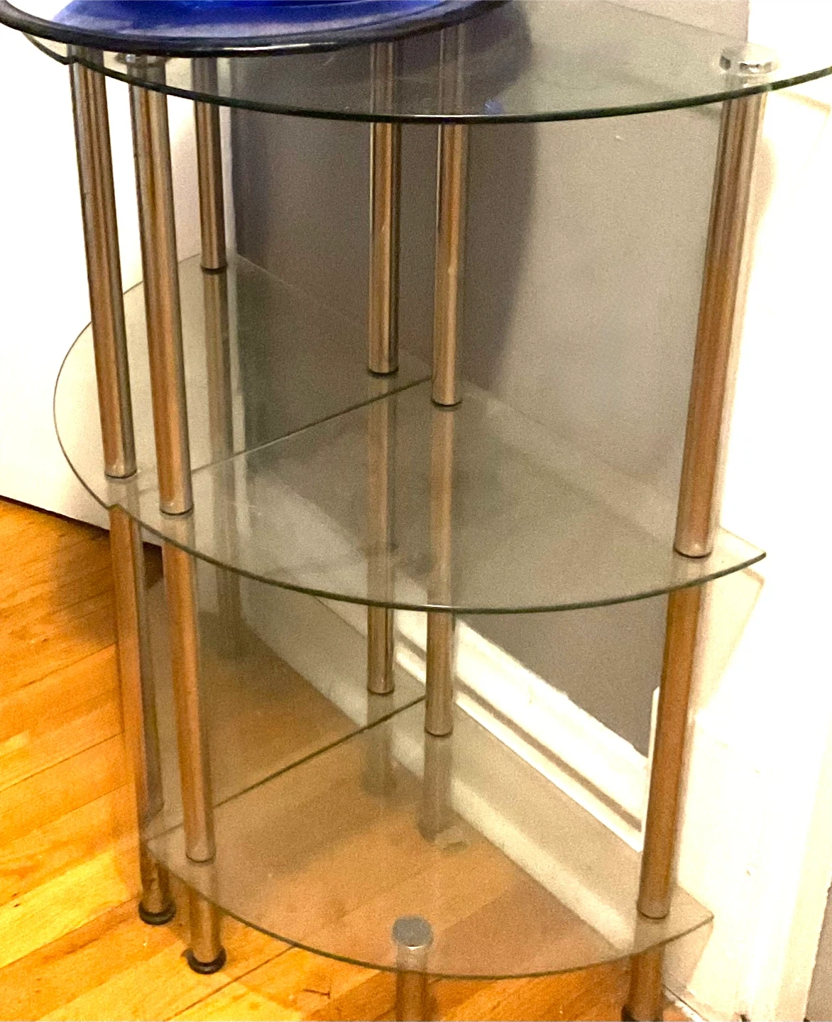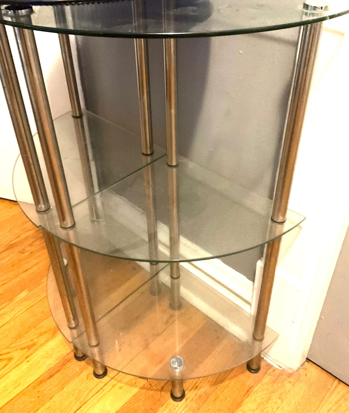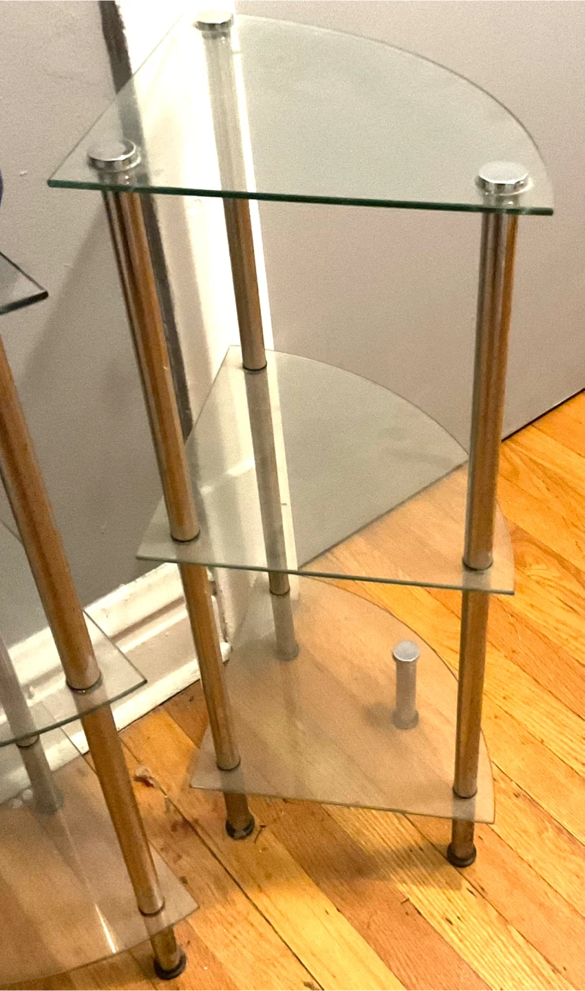 Selling a 2 piece Glass 3-Tier Corner Shelf corner with glass shelves and metal legs. It's in excellent condition and would be perfect for a small space