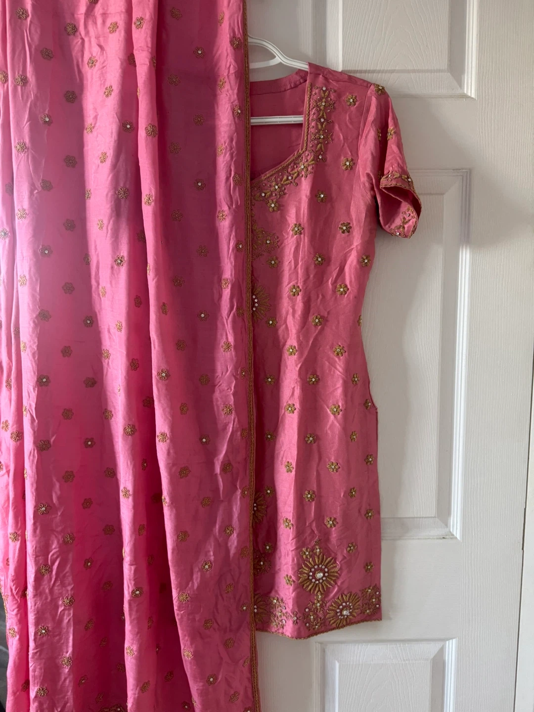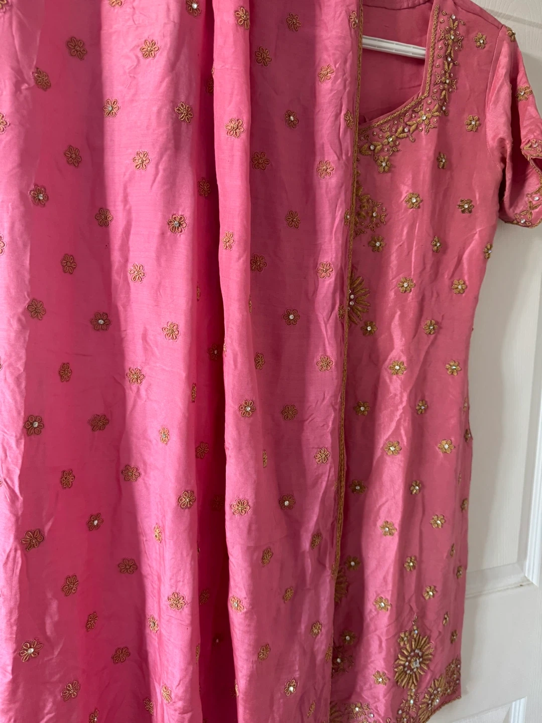 109Beautiful pink salwar kameez with intricate gold embroidery. Perfect for a special occasion! The set includes the kameez (top), salwar (pants), and dupatta (scarf).