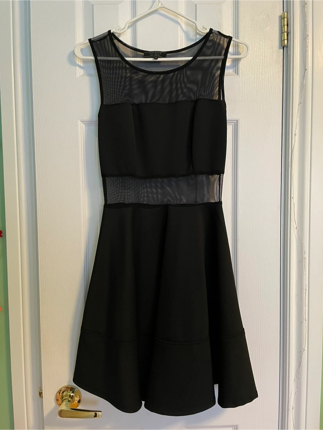 Shoulder straps and midriff sheer, bodice and skirt slightly heavier fabric. Sleeveless. Skirt comes to above knee.