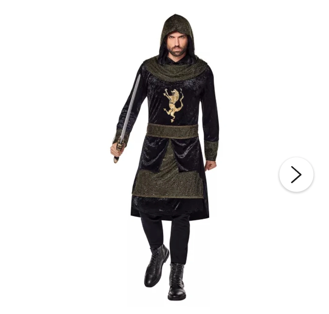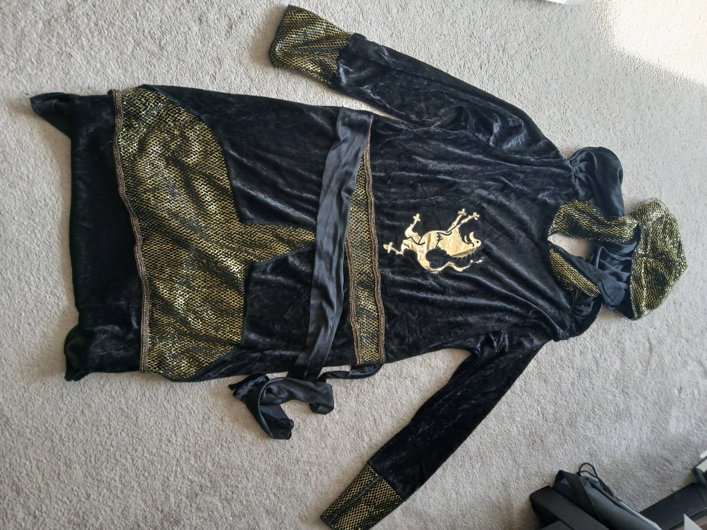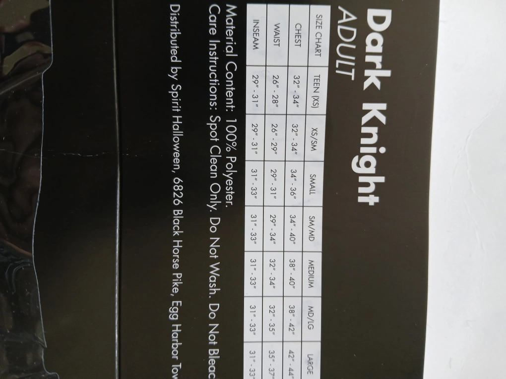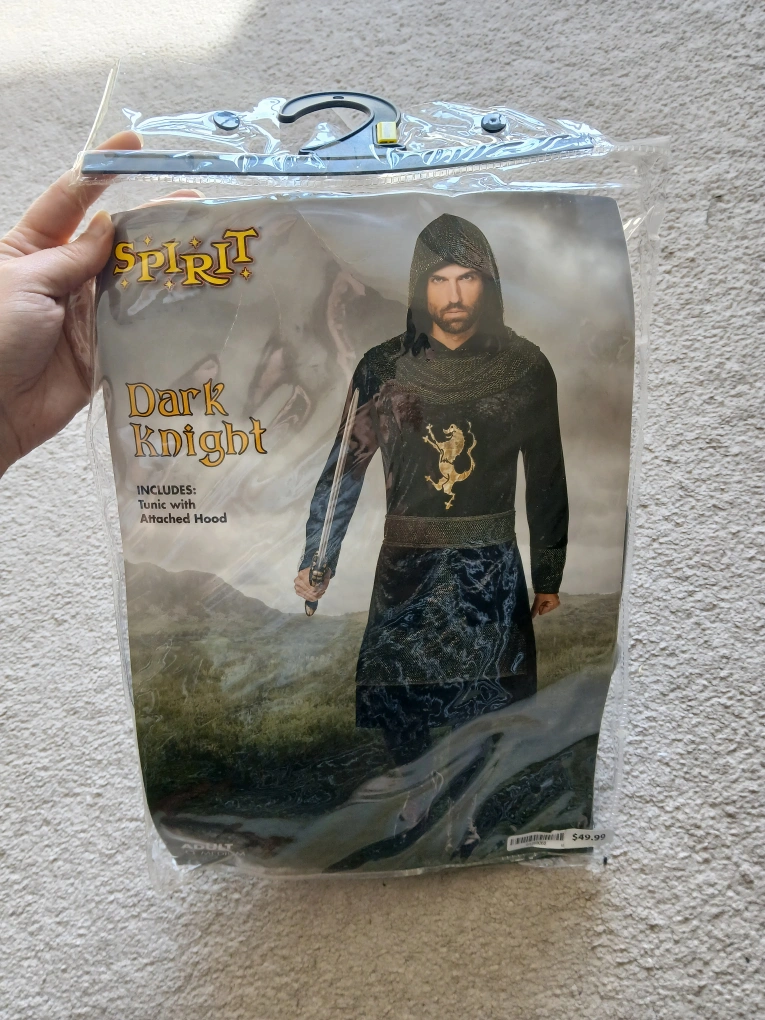 796Spirit Halloween costume. Dark Knight costume featuring a tunic with a hood. Features a dragon emblem. size medium for adults Worth around $60 According to their measurement chart size medium is best for 38 - 40 inches chest, 3w - 34 inches waist, and 31 - 33 inches inseam. It has some stretch though! Only used once indoors.