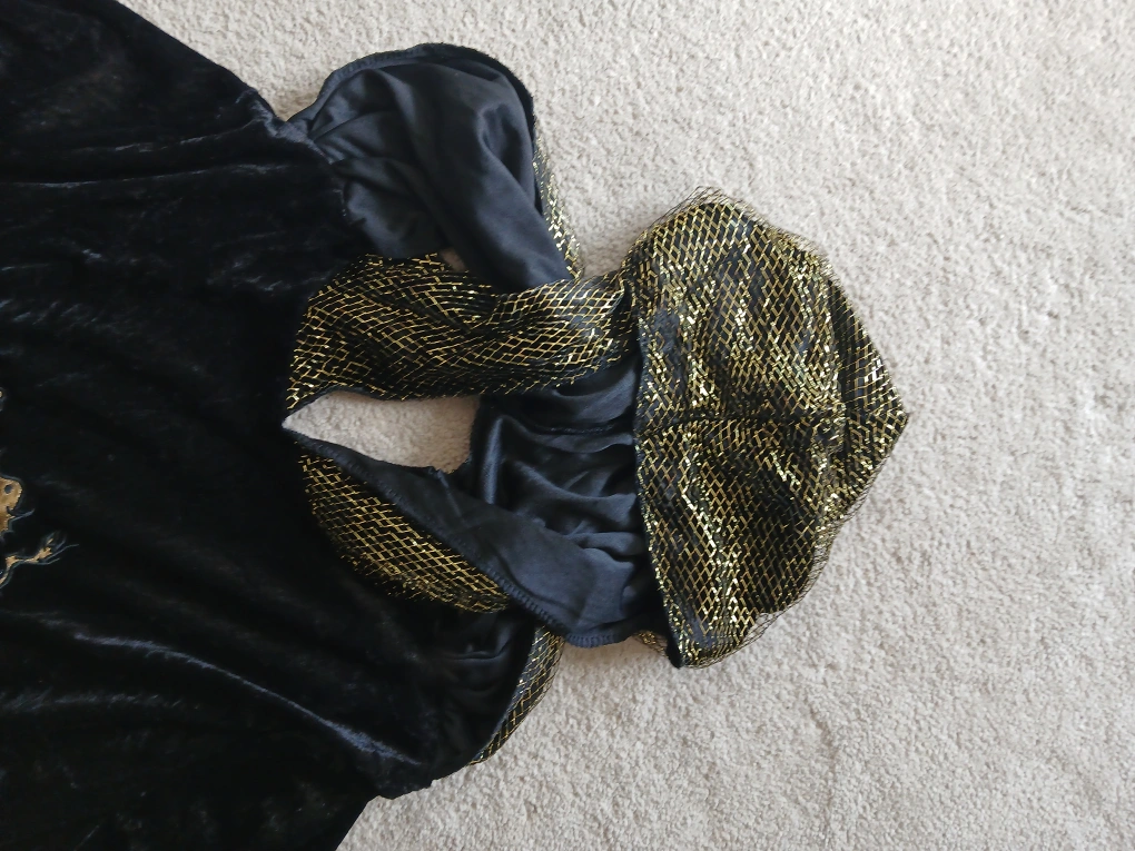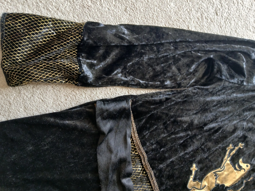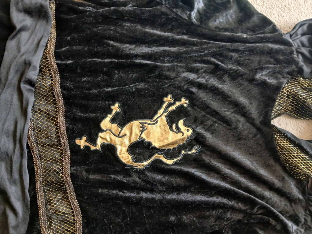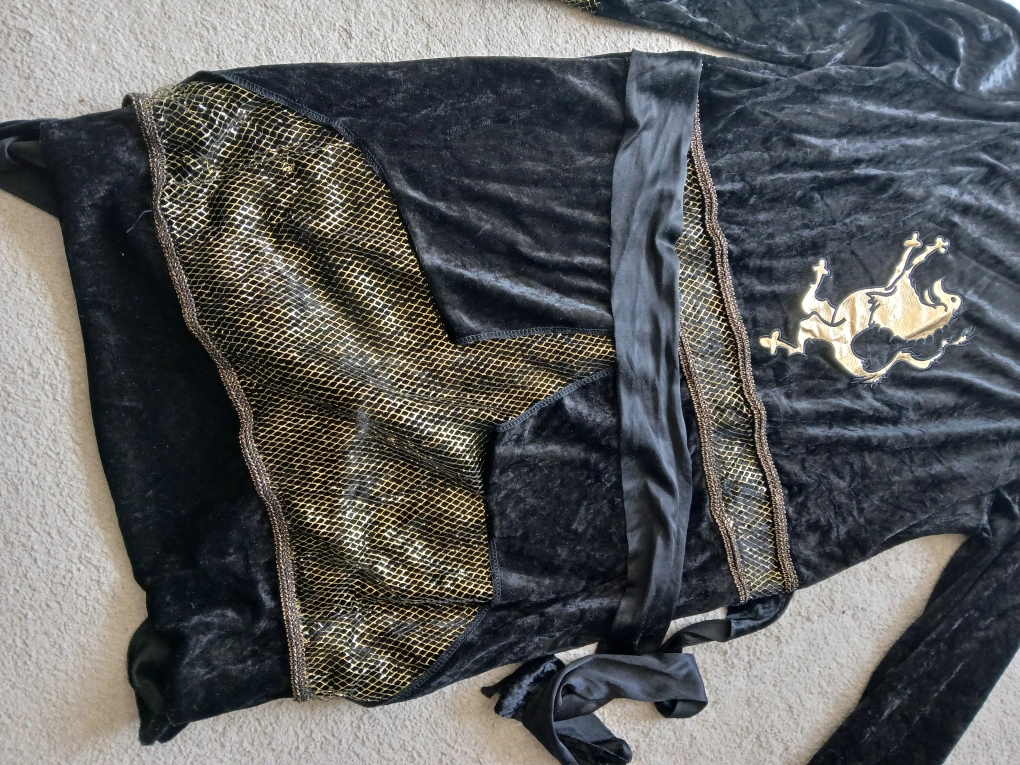 796Spirit Halloween costume. Dark Knight costume featuring a tunic with a hood. Features a dragon emblem. size medium for adults Worth around $60 According to their measurement chart size medium is best for 38 - 40 inches chest, 3w - 34 inches waist, and 31 - 33 inches inseam. It has some stretch though! Only used once indoors.