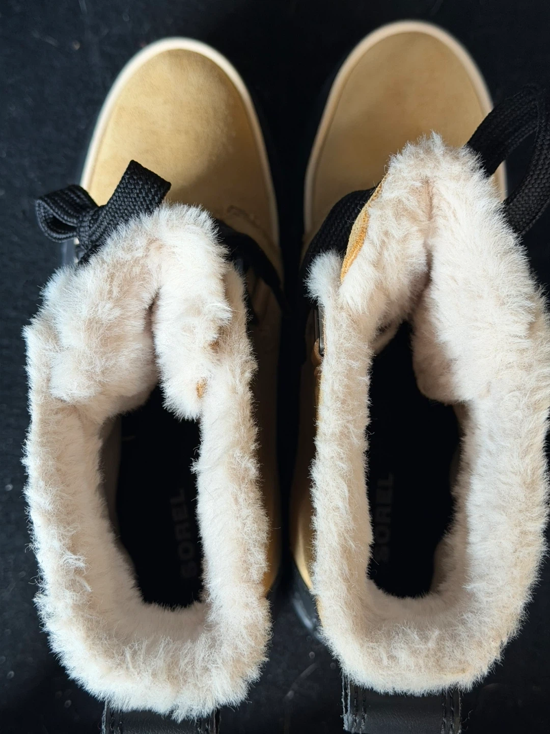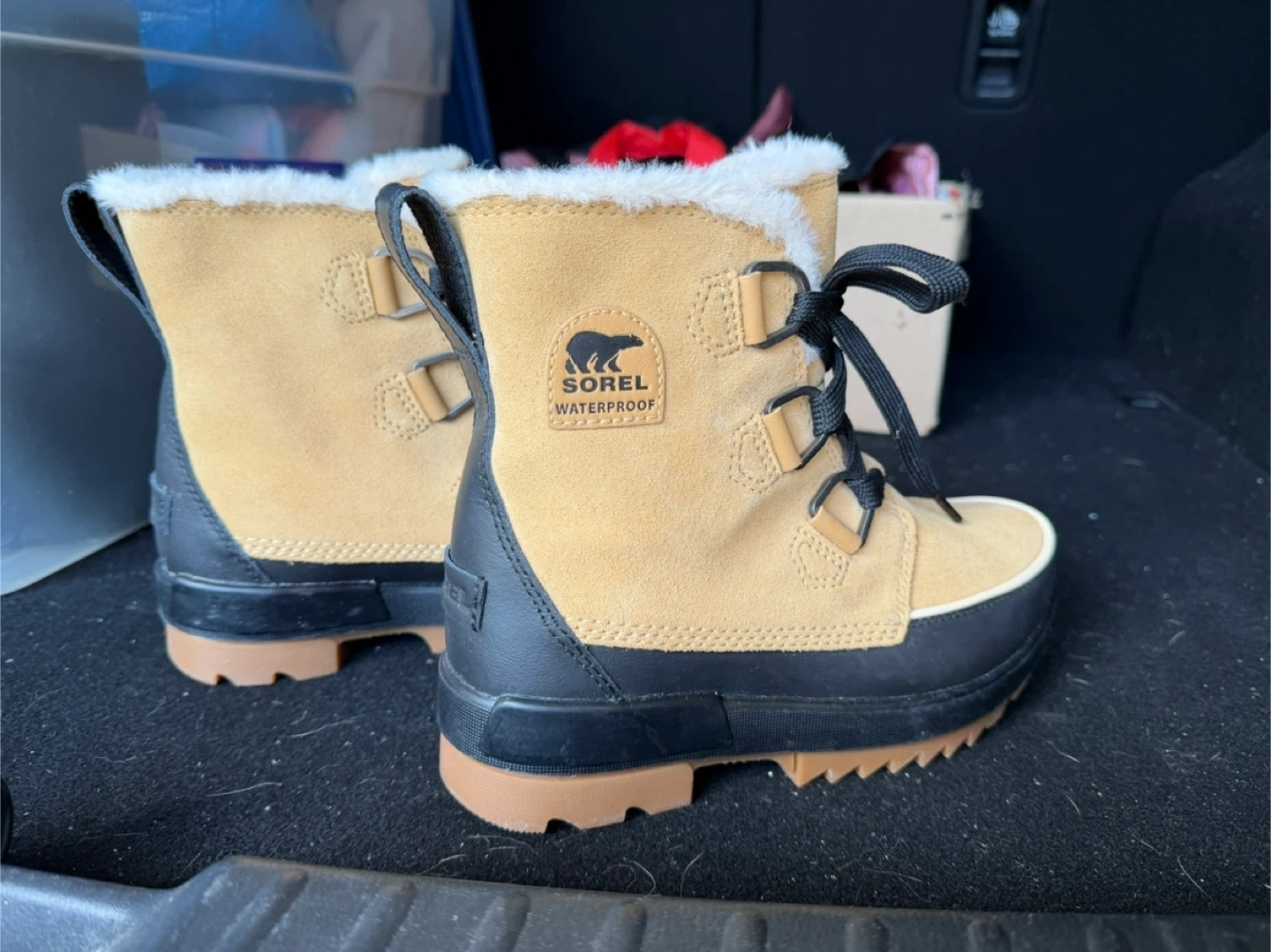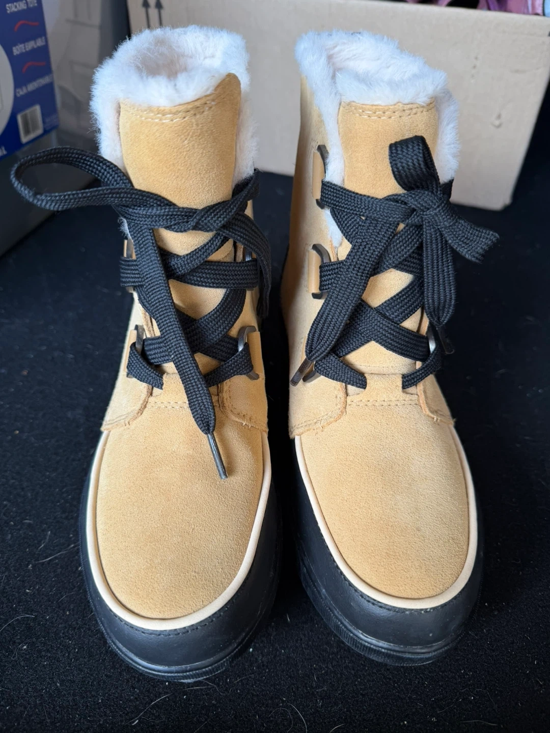 Mint condition 9/10. Sorel waterproof boots in women's size 7.5. These are a stylish and practical choice for keeping your feet warm and dry! The boots feature a tan suede upper with black laces and a black rubber sole.. Perfect for the Canadian winter!