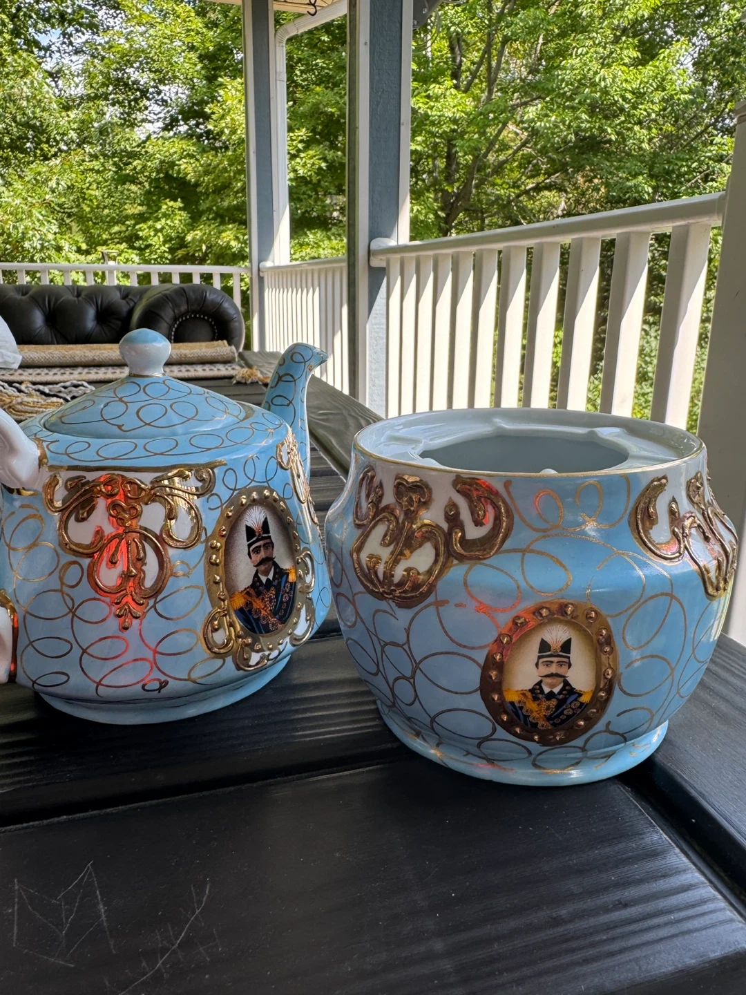 Selling a lovely TOOS Porcelain teapot set. It's a beautiful light blue colour with gold accents and portrait details. The set includes the teapot, a warmer, and a small candle holder. It's marked as Hotels Ware, and is dishwasher and microwave safe on the bottom.