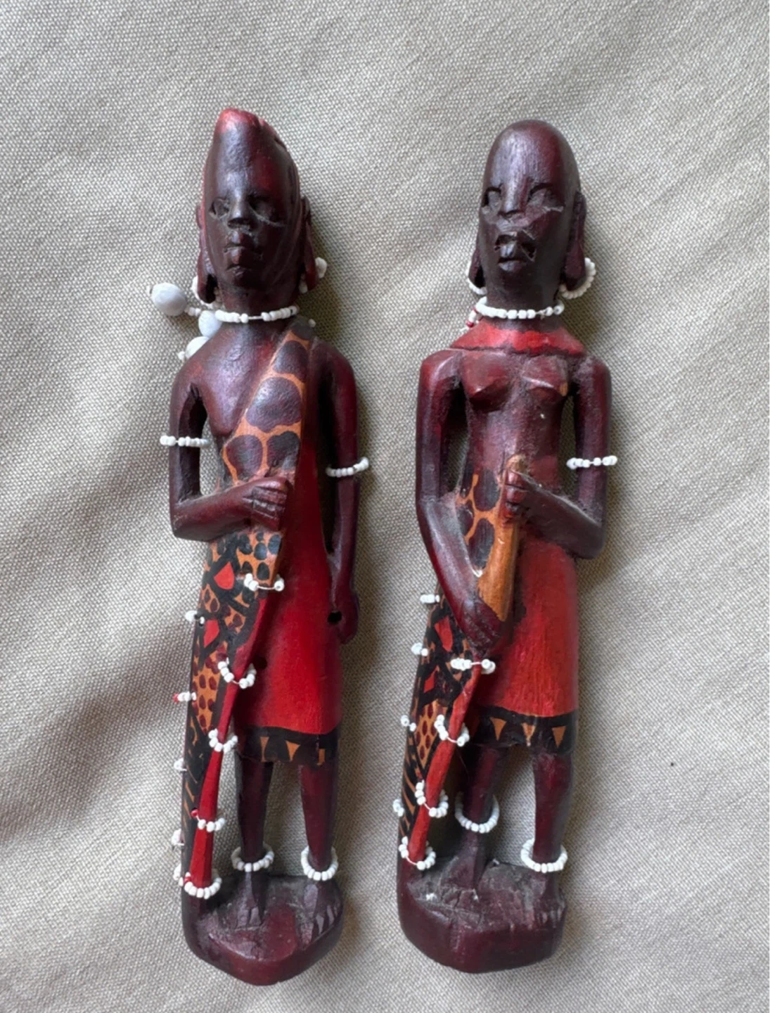 Selling a set of two African tribal figurines. They appear to be hand-carved from wood and painted with red and black details. The figurines feature white bead accents. They would make a unique addition to any collection or home decor
