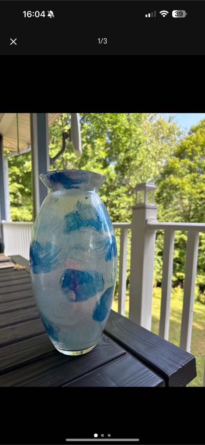 Selling a beautiful blue and white decorative vase! It's in great condition and would look lovely in any home. The vase features a unique hand-painted design with swirling patterns of blue and white. It's perfect for displaying flowers or as a standalone decorative piece