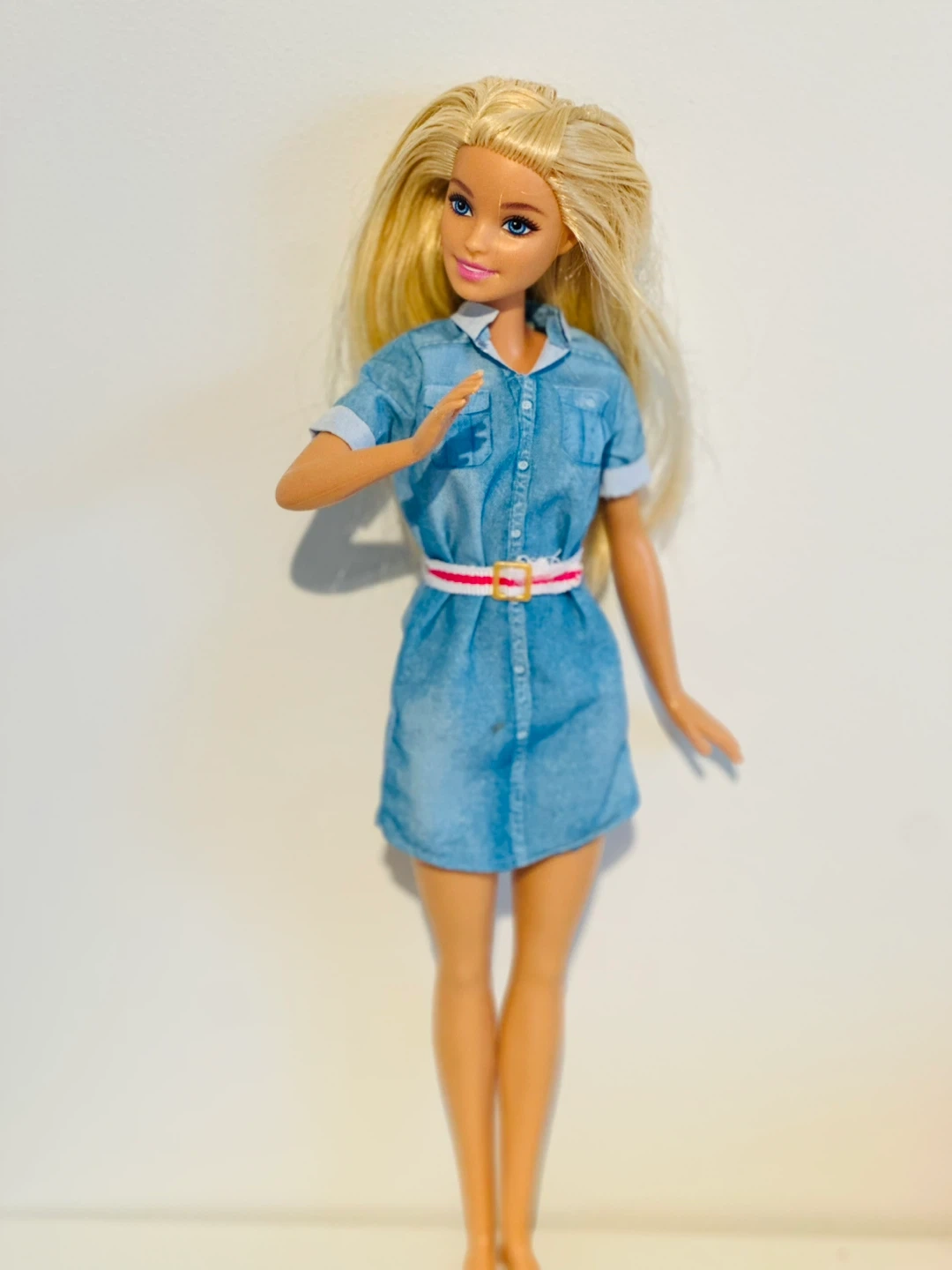 Selling a Barbie doll dressed in a cute denim dress with a white and pink belt! She's in great condition and ready for a new home in your collection or for playtime
