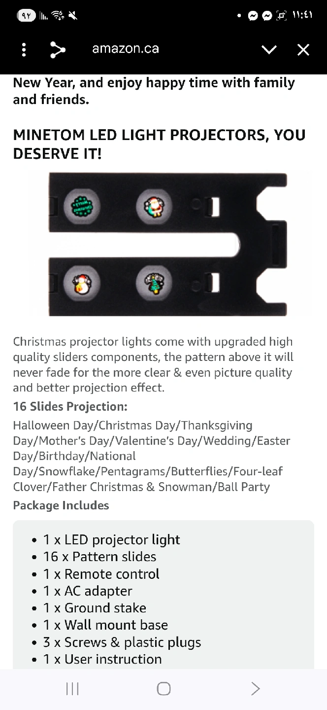 Selling a Minetom projector light, perfect for adding some festive cheer to your home! It features multiple light effects with single and mixed multicolors, plus 16 pattern slides. The RF remote control and auto timer setting make it super convenient to use. It's also IP65 waterproof, so it's great for outdoor use all year round. Includes ground stake and wall mount base for easy installation!