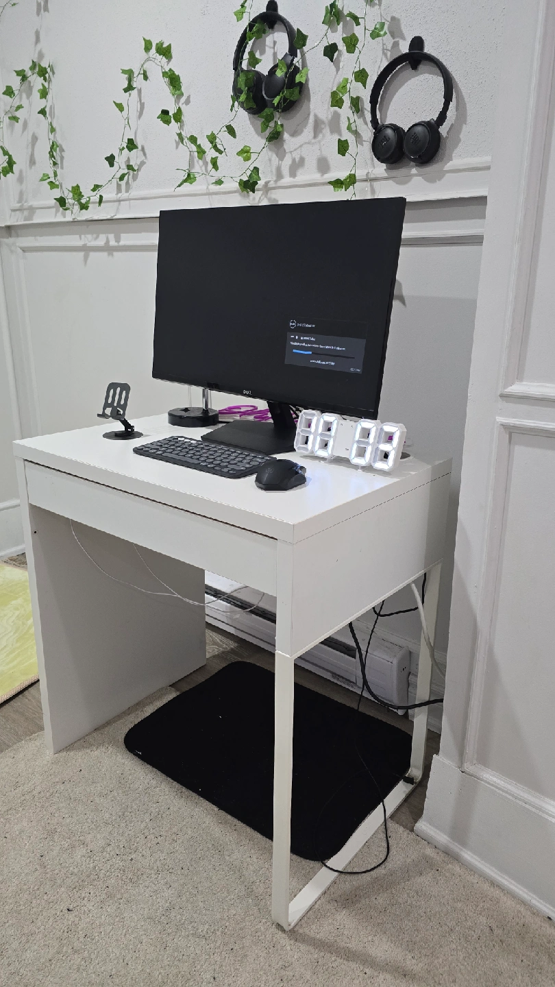 Selling a simple white desk, perfect for a small space! It features a handy drawer for storage. The desk is in great shape and ready for a new home. Dimensions are approximately 73cm (28 3/4") wide, 50cm (19 5/8") deep, and 75cm (29 1/2") high