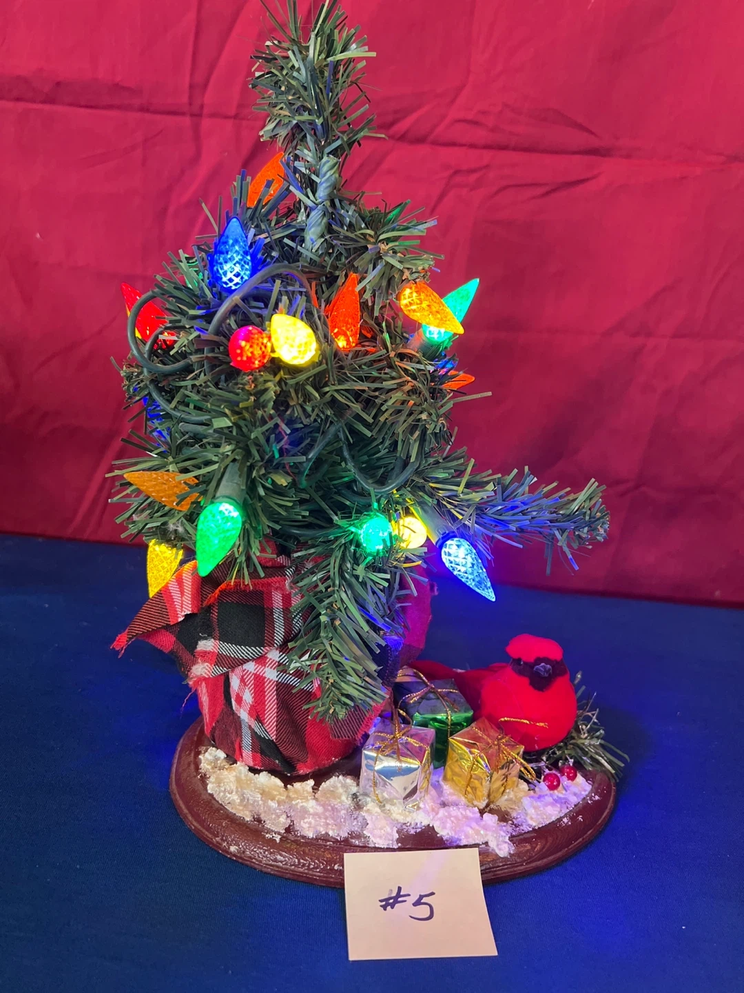 Handcrafted table top tree, perfect for gift giving, decoration or for places where full size tree won’t fit! Tree lights up and is approximately 8”x 6”x 12”.